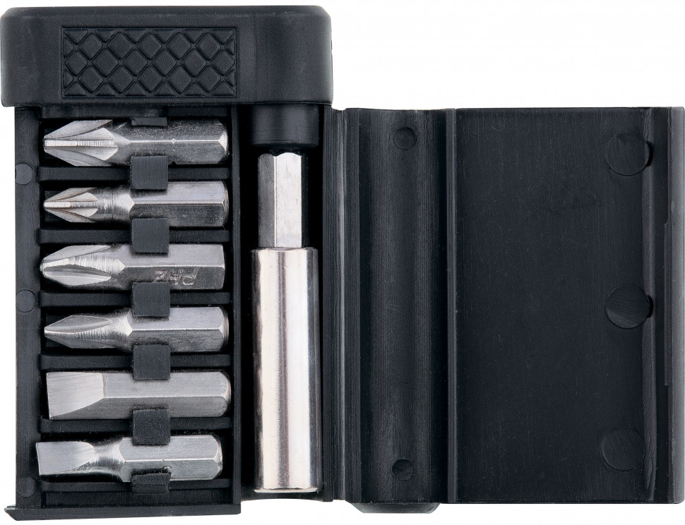 Набор состоит из магнитного держателя и сменных отверточных бит, изготовленных из легированной стали марки 45Х, которая сочетает в себе высокую твердость (53–54 HRc) с износостойкостью.