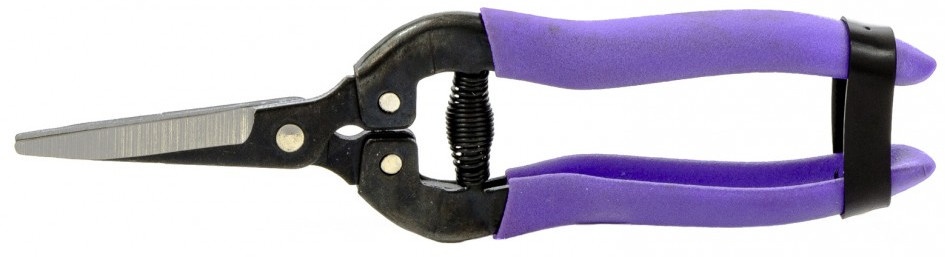 Цветочный секатор с прямым резом, обрезиненными рукоятками и петлевым фиксатором, расположенным на конце одной из рукояток. Предназначен для ухода за цветами и растениями. |