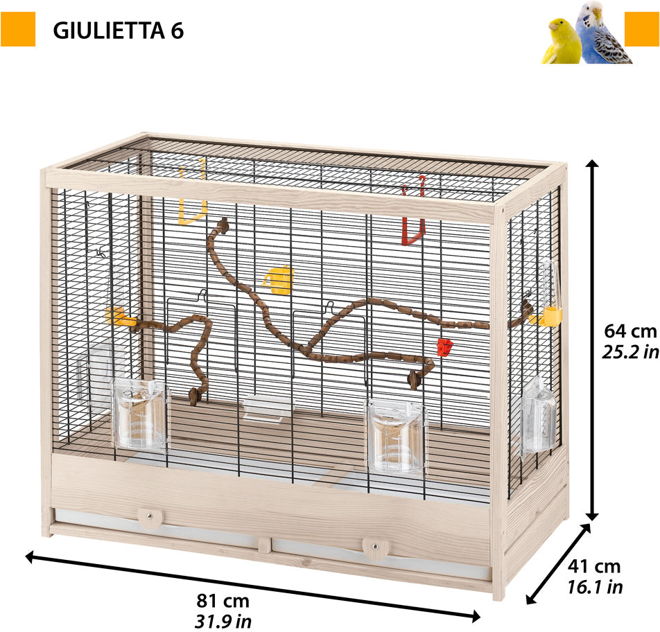 В линейке Giulietta вы найдете клетки разных размеров, подходящие к соответствующим деревянным подставкам. Giulietta 5 и 6 — большие клетки для содержания нескольких птиц вместе. Все клетки изготовлены из прочной металлической окрашенной проволоки и древесины марки Tree Friend, означающей, что дерево было срублено на участках с разрешения и под управлением организаций, осуществляющих контроль над сохранением мировых лесов и предотвращению их вырубки на нашей планете.