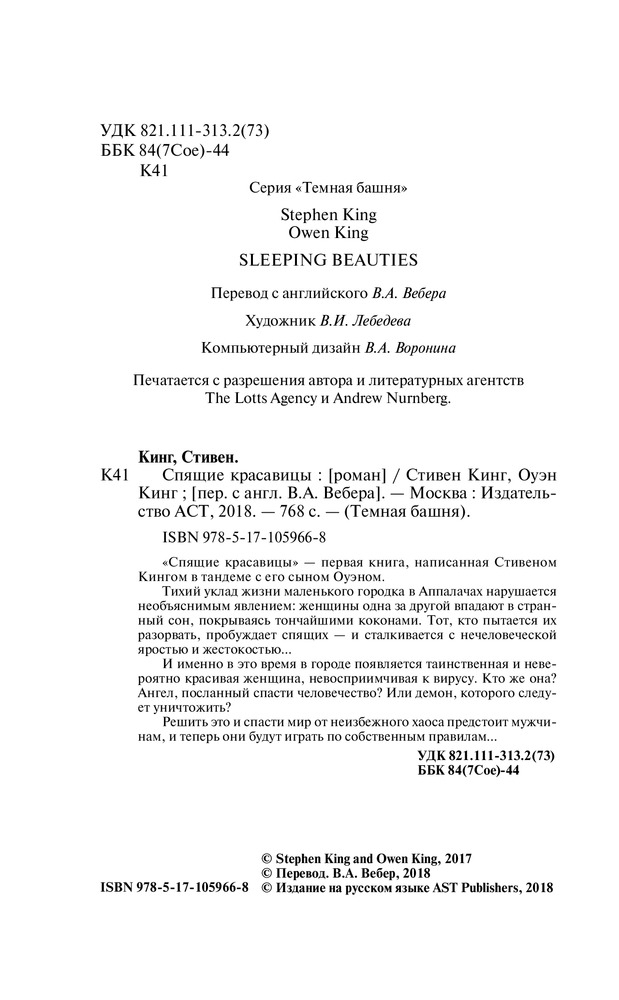 Спящие красавицыВ данный момент этот товар отсутствует в продаже. Возможно, у нас найдется аналогичный или похожий товар здесь. Серия: Темная Башня Что станет с миром, из которого внезапно исчезнут все женщины? Новый захватывающий роман, написанный признанным мастером современной прозы Стивеном Кингом в соавторстве с сыном Оуэном. |