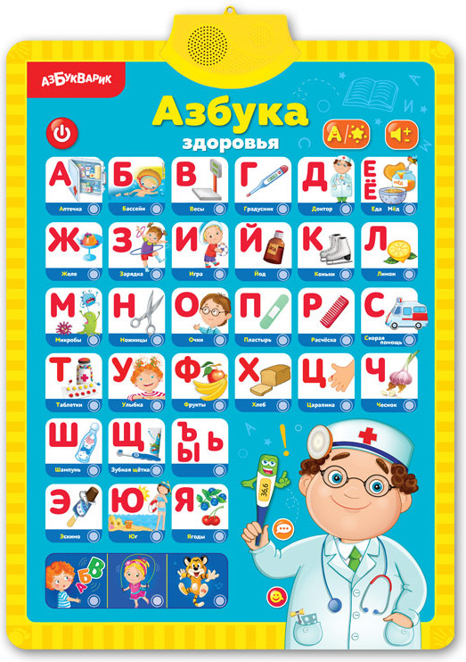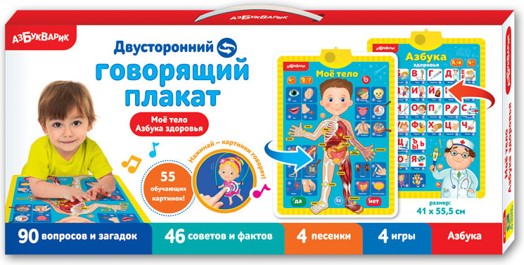 Азбукварик Моё тело. Азбука здоровьяВ данный момент этот товар отсутствует в продаже. Возможно, у нас найдется аналогичный или похожий товар здесь. Серия: Говорящий плакат На первой стороне плаката представлены интересные факты о теле человека и изображены самые важные органы, на второй — говорящая азбука, слова и полезные советы! |
