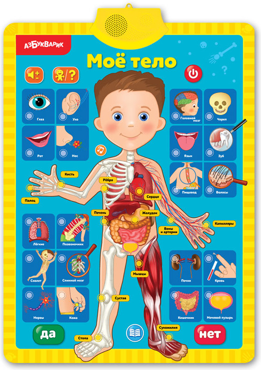 Плакат очень познавательный, малышу очень интересно изучать части тела и азбуку, звуки регулируются.