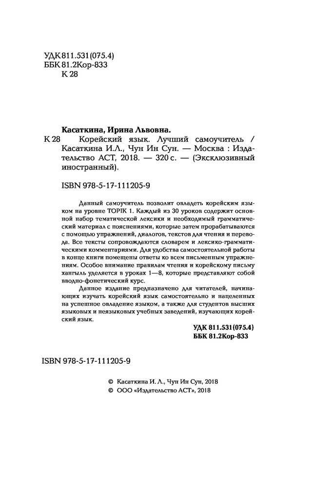 💳 Оплатить за товар можно при получении 🇰🇿 Есть бесплатная доставка по Казахстану от 1 дня 🎁 Копите бонусы с каждой покупки Серия: Эксклюзивный иностранный Данный самоучитель позволит овладеть корейским языком на уровне TOPIK 1. Каждый из 30 уроков содержит основной набор тематической лексики и необходимый грамматический материал с пояснениями, которые затем прорабатываются с помощью упражнений, диалогов, текстов для чтения и перевода. Все тексты сопровождаются словарем и лексико-грамматическими комментариями. Для удобства самостоятельной работы в конце книги помещены ответы ко всем письменным упражнениям. Особое внимание правилам чтения и корейскому письму хангыль уделяется в уроках 1–8, которые представляют собой вводно-фонетический курс. |