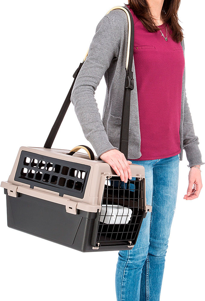 Контейнер-переноска для кошек и мелких собак. Удобная и универсальная, в комплекте с ручкой и плечевым ремнем из прочного нейлона. Ремень регулируется по длине и облегчает переноску животного. Переноска Atlas Trendy Plus поставляется в комплекте с аксессуарами, необходимыми для комфортного путешествия вашего питомца: подушкой и пластиковой миской, чтобы в пути можно было накормить и напоить животное.