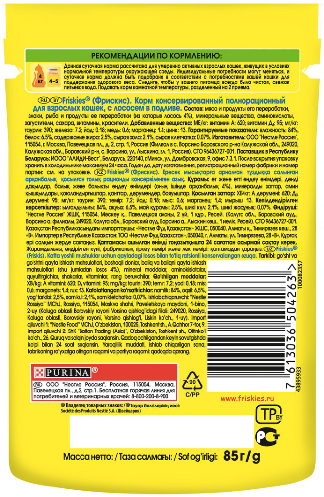 Friskies Корм влажный для кошек с лососемВ данный момент этот товар отсутствует в продаже. Возможно, у нас найдется аналогичный или похожий товар здесь. Условия хранения товара: температурный режим от -10 до +25°С. |