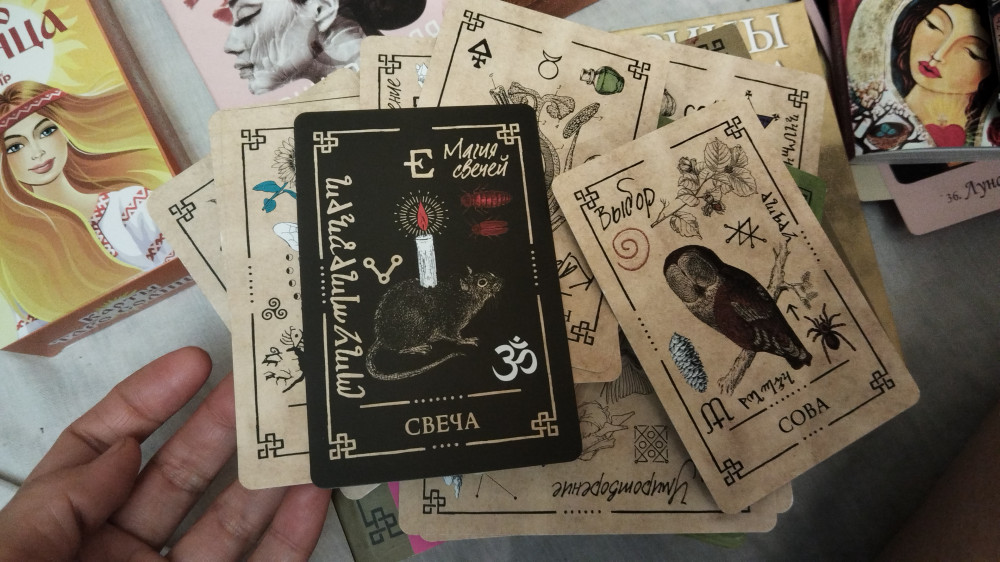 Забыла добавить насколько она ритуальная. Руководство к действию. Сжиганию, сшиванию, раскрашиванию. Практическое пособие для практикующих. Ведьмочки поймут. Прям дышит лесом и кореньями. А еще. Язычество бывает таким разным. Тот же двуглавый ворон на одной из карт - не только Византия, он же на гербе Чингизхана(также как и свастика со славянских рун и не только) по официальной версии из захоронений обнаруженных учеными. Кому нужно приведу источники, чтобы не быть голословной. Но дело даже не в этом. Викканство, тенгрианство шаманизм - как не назови .. Суть едина.. Не важно какой эгрегор выбирает тебя... (Редко ты его) Важно лишь, что тени - это зеркало. Которое позволяет разглядеть в себе - себя. Рада быть полезной