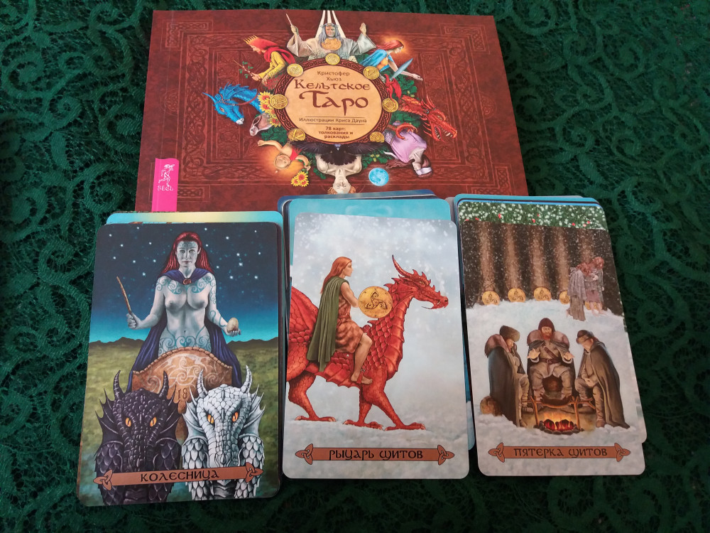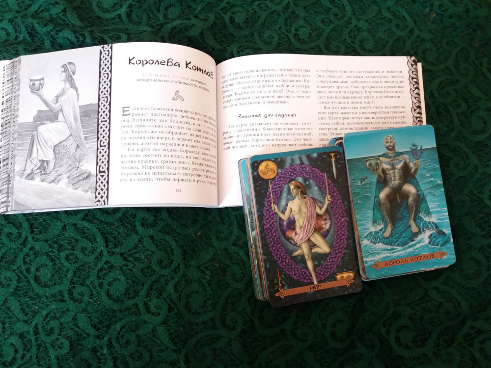Карты выпущены в подарочной очень плотной коробке и дополнительно лежат в отдельном футляре, что очень удобно. МБК на белой бумаге, 224 страницы текста, в котором для меня ничего нового. Всего три расклада. Две масти имеют другое название. Традиция - Уэйт. Карты матовые, как сейчас модно - без рамки. Карты яркие по цвету. По сюжету похожи на колоды Б.Мур. Лично мне не хватило именно привязки к кельтским божествам и мифам, по этой причине и сняла одну звезду.