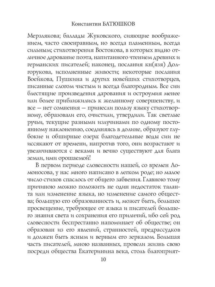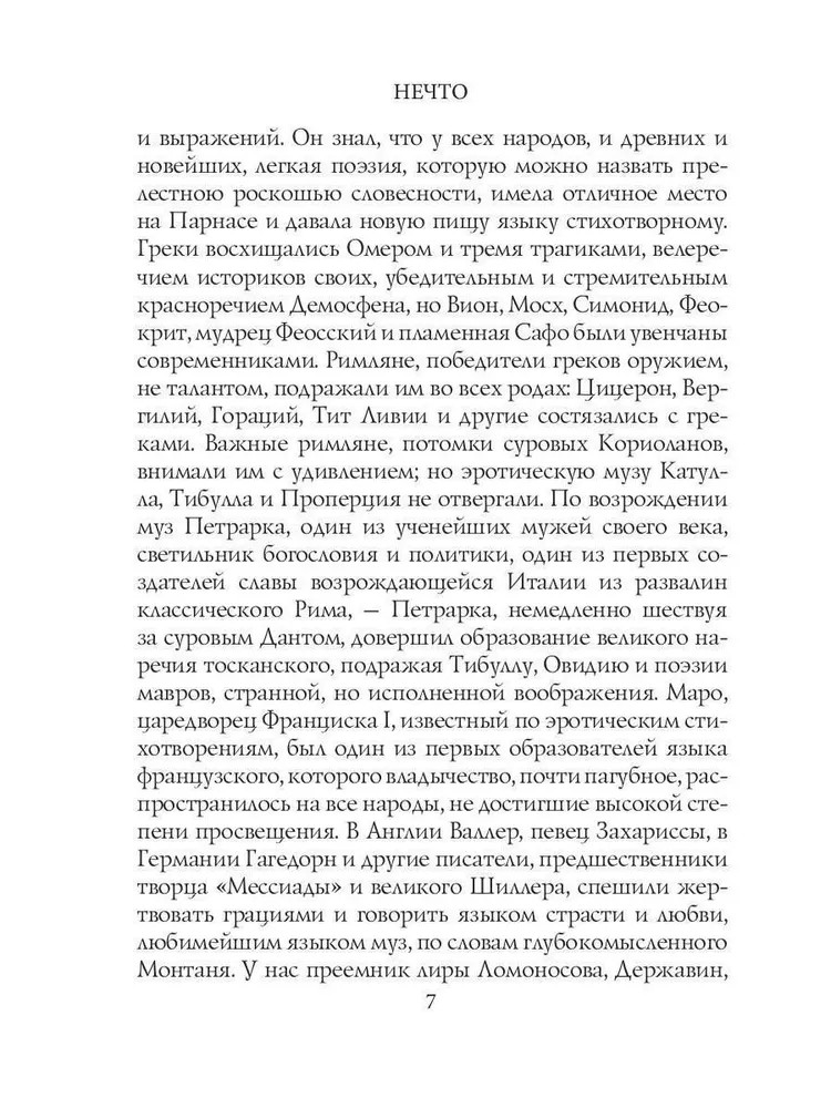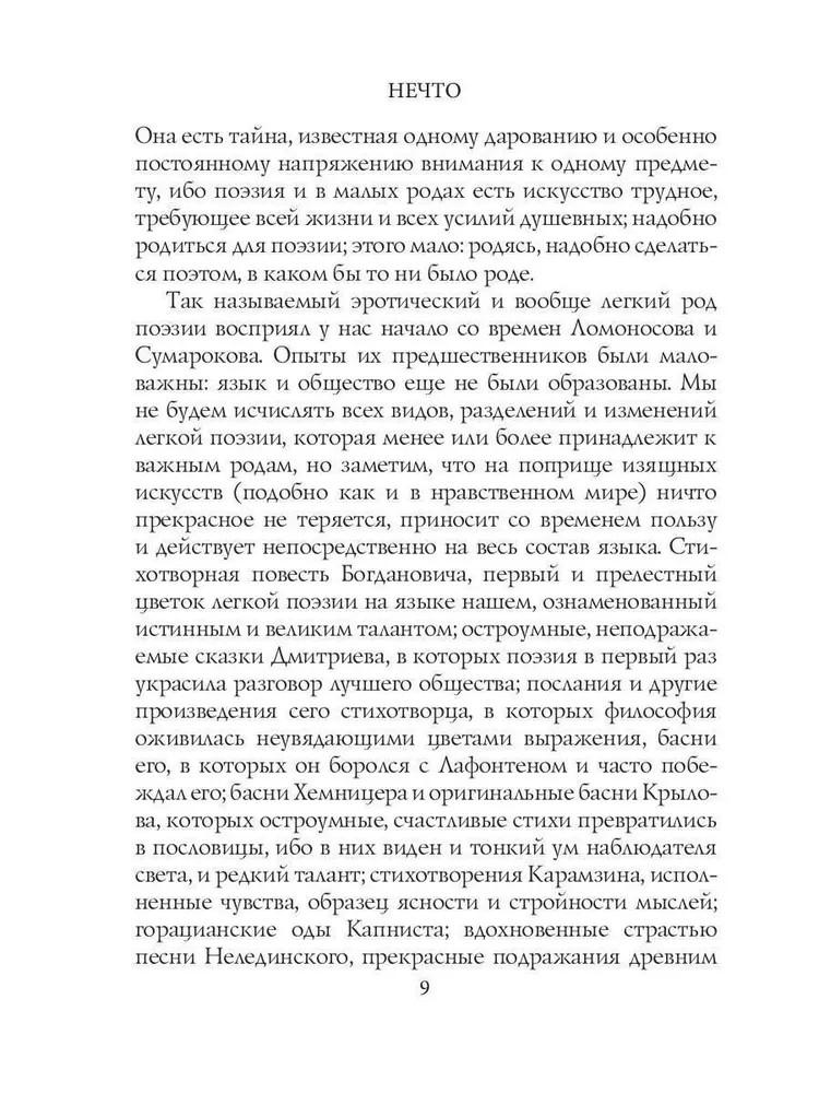 Константин Николаевич Батюшков — значительная фигура в истории русской литературы и словесности, являющаяся непосредственным и ближайшим предшественником А. С. Пушкина. «Нечто» — необыкновенный сборник публицистических и критических статей Батюшкова, обозначенных самим автором как «опыты в прозе». В книге представлены размышления Батюшкова о предназначении поэта, сущности поэзии и морали, а также о творчестве великих личностей, среди которых: М. Ломоносов, А. Кантемир, М. Муравьёв, Л. Аристо, Т. Тассо и Ф. Петрарка. Книга будет интересна широкому кругу читателей. |