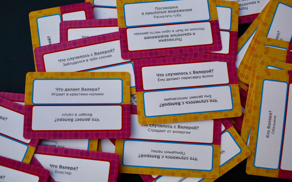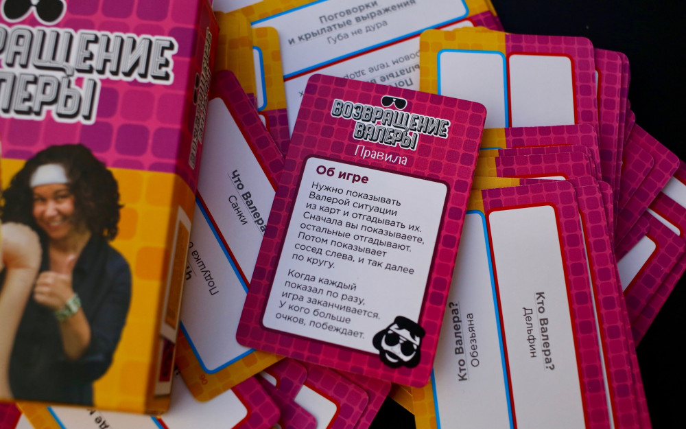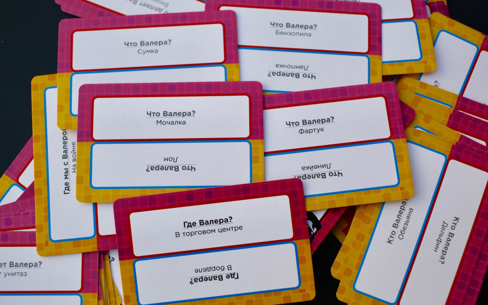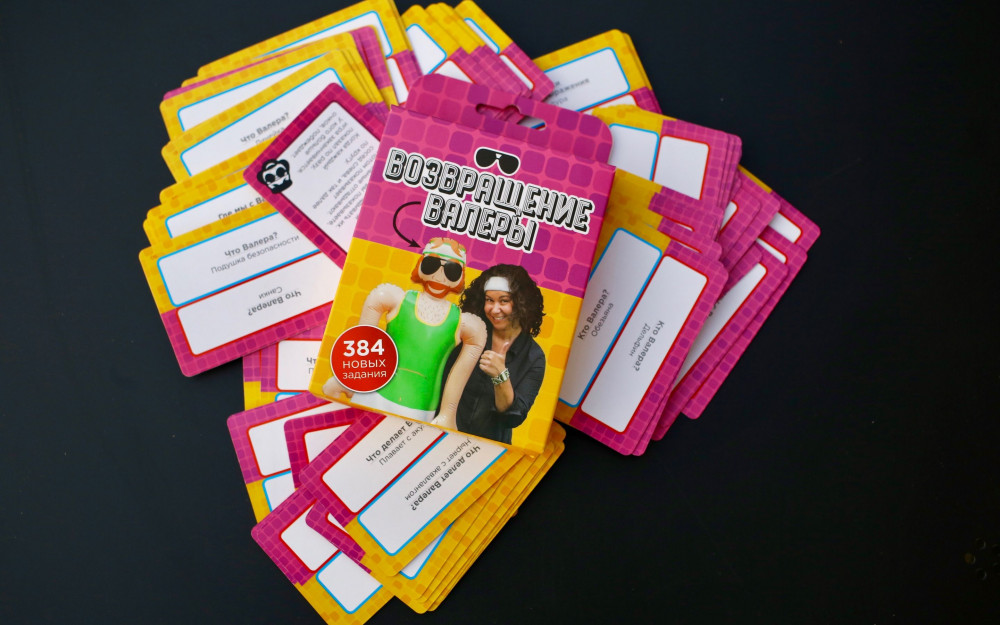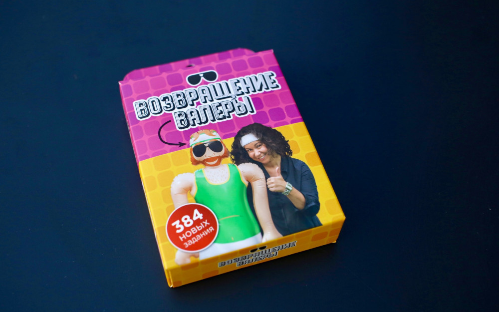 В наборе возвращение Валеры вы найдёте новые карточки с поводами скрутить этого добродушного парня в бараний рог. Обратите внимание, что надувной куклы в этом дополнении нет, (её нужно найти в базовом наборе), но можно попросить одного из участников взять на себя его роль.