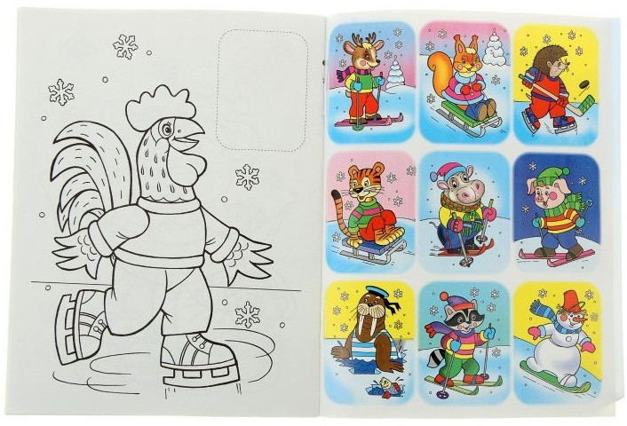 Хорошая раскраска, крупные рисунки. Единственное, что в нашем варианте не наклейки, а вверху - маленькие картинки-образцы, что тоже интересно. Рисунков всего 16. Буду заказывать еще из этой серии.