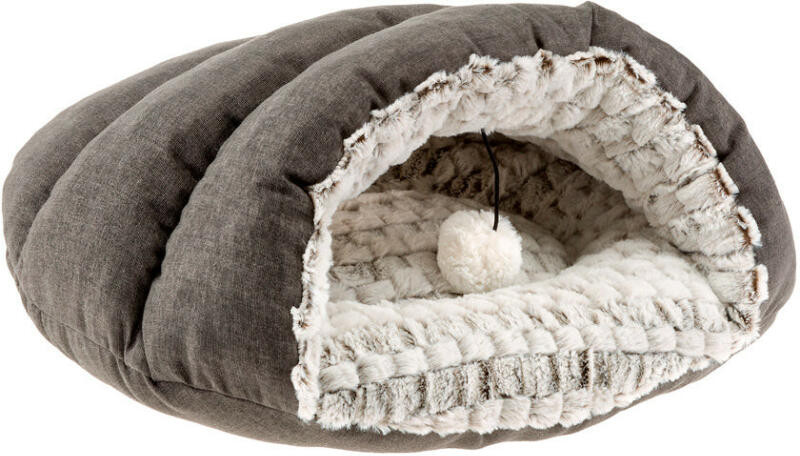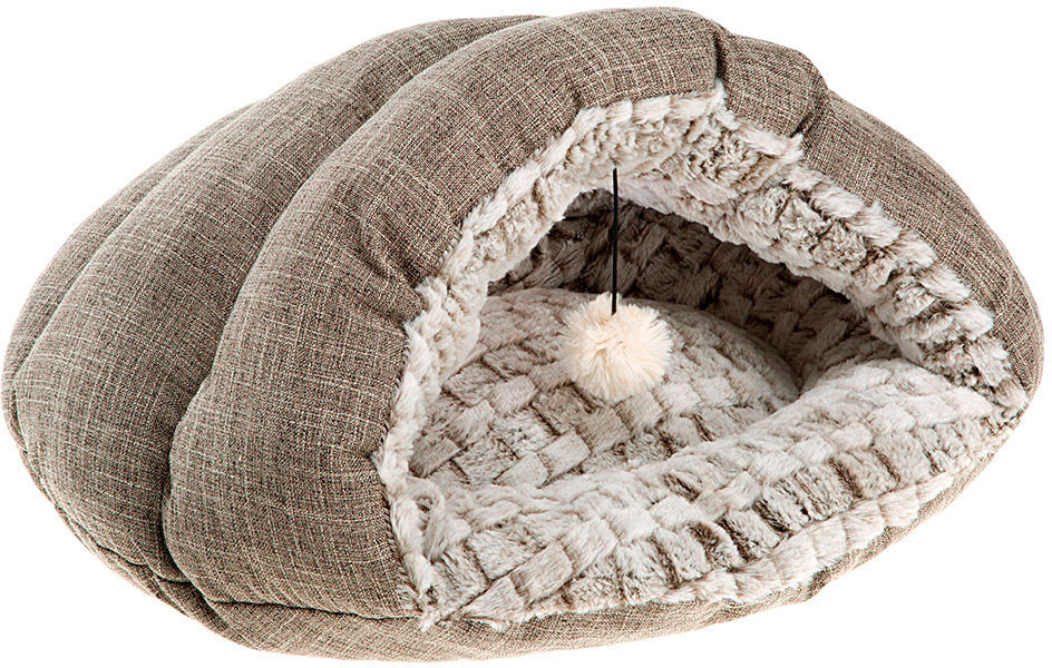 Уютный теплый лежак-пещерка для маленьких питомцев — кошек или декоративных собак. Вход расположен с фронтальной стороны и имеет подвесную игрушку, которая всегда занимает много внимания кошек. Внутри питомцу удобно и тепло за счет объемных стенок и низа. Высота домика 24 см. Подходит для холодного времени года и теплолюбивых питомцев.