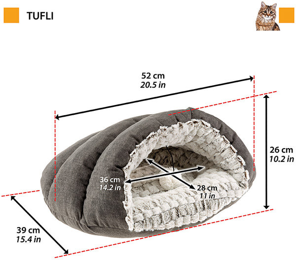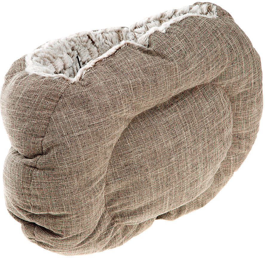 С внешней стороны пещерка имеет обивку из плотной ткани с груботканной фактурой. Ткань практичная и не маркая. Внутри очень мягкий приятный искусственный мех с коротким ворсом. Аксессуар имеет небольшой вес и не занимает много места. Подходит для машинной стирки при t 30°C. Частые стирки не влияют на качество лежака — мех не слеживается и остается таким же мягким и пушистым, а ткань не линяет и дает усадку.