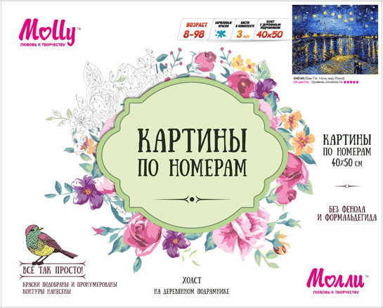 Molly Набор для раскрашивания по номерам на холсте «Ван Гог. Ночь над Роной» (40×50 см)В данный момент этот товар отсутствует в продаже. Возможно, у нас найдется аналогичный или похожий товар здесь. Серия: Картины по номерам на холсте С помощью набора для творчества можно нарисовать одну из самых известных картин голландского художника-импрессиониста Винсента Ван Гога «Ночь над Роной». На картине запечатлен небольшой город Арль на юге Франции. Большую часть картины занимает звездное небо. На переднем плане видны фигуры влюбленных. |