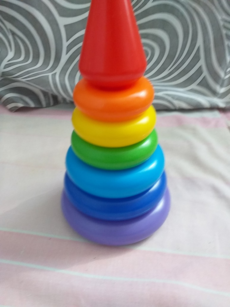 Отличная пирамидка. Яркие цвета, хороший пластик, верхушка плотно сидит и держит все кольца. Можно изучать радугу, все цвета расположены по порядку. Цена - качество на высшем уровне.