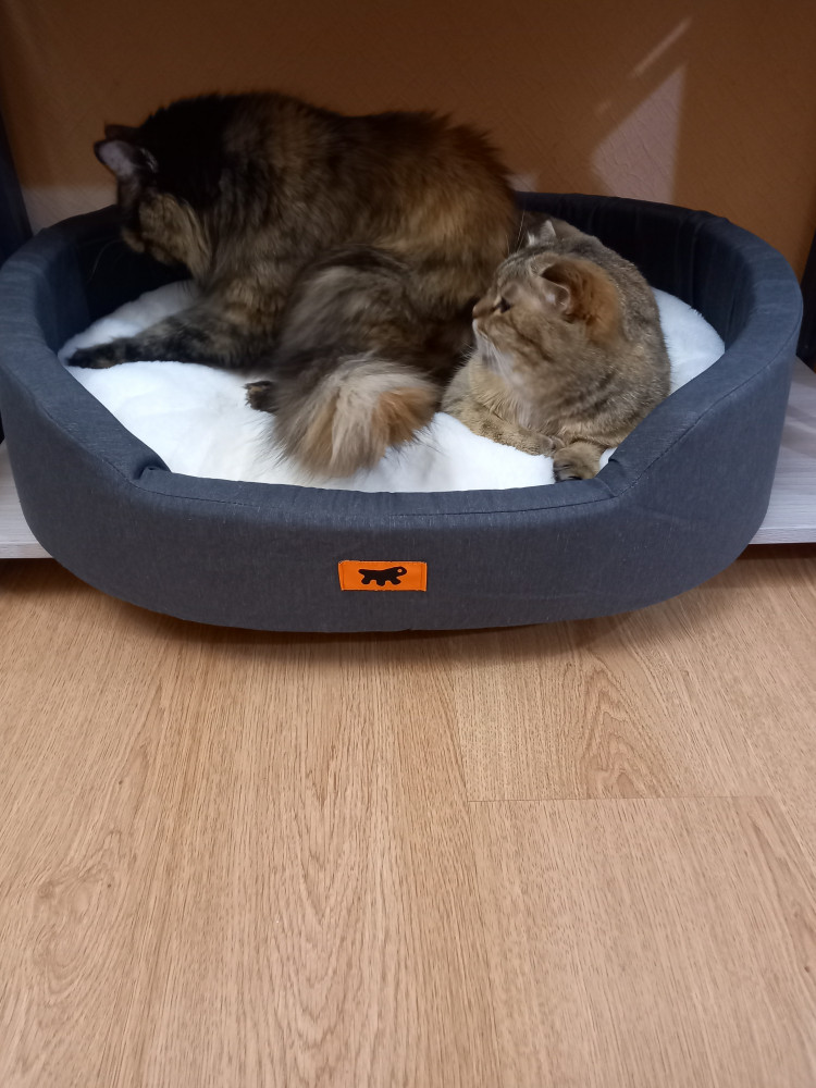 Отличная лежанка. Купила большой размер, чтобы одновременно помещались две кошки. Внутри съёмная мягкая подушка.