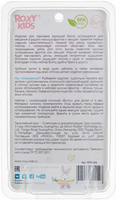 ROXY-KIDS Ниблер для прикорма малышейВ данный момент этот товар отсутствует в продаже. Возможно, у нас найдется аналогичный или похожий товар здесь. Серия: Bunny Twist Малышам 4-6 месяцев начинают вводить прикорм. Но если с пюре и кашками все понятно, то как быть с фруктами, овощами, печеньем? Кроха еще не обзавелся комплектом зубов, чтобы самому все пережевывать. Безопасный и удобный способ ввода таких продуктов питания — ниблер «Bunny Twist». |