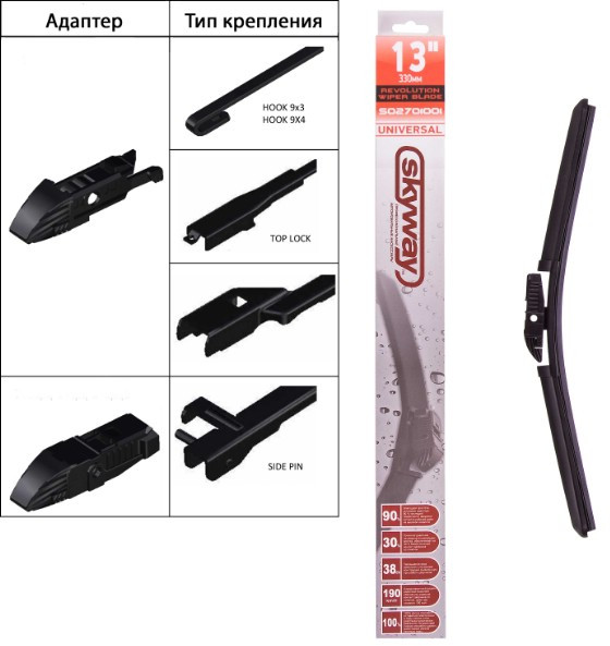 Щетка стеклоочистителя бескаркасная Skyway универсальный адаптер — бескаркасные щётки стеклоочистителя Skyway обеспечивают равномерное очищение всей поверхности стекла. Универсальный адаптер позволяет использовать щетку на большинстве автомобилей. Бескаркасная щетка из натурального каучука удаляет даже самые мелкие частицы воды,а графитовое покрытие снижает уровень шума и увеличивает срок службы. Щетка гладко и беспрепятственно скользит по поверхности с минимальным усилием, а резина остается эластичной в при любых условиях. Щетка плотно прилегает к стеклу даже на большой скорости, надежно защищая его от загрязнений.