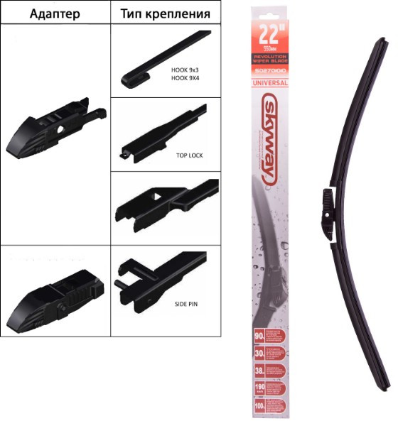 Щетка стеклоочистителя бескаркасная Skyway универсальный адаптер — бескаркасные щётки стеклоочистителя Skyway обеспечивают равномерное очищение всей поверхности стекла. Универсальный адаптер позволяет использовать щетку на большинстве автомобилей. Бескаркасная щетка из натурального каучука удаляет даже самые мелкие частицы воды,а графитовое покрытие снижает уровень шума и увеличивает срок службы. Щетка гладко и беспрепятственно скользит по поверхности с минимальным усилием, а резина остается эластичной в при любых условиях. Щетка плотно прилегает к стеклу даже на большой скорости, надежно защищая его от загрязнений.