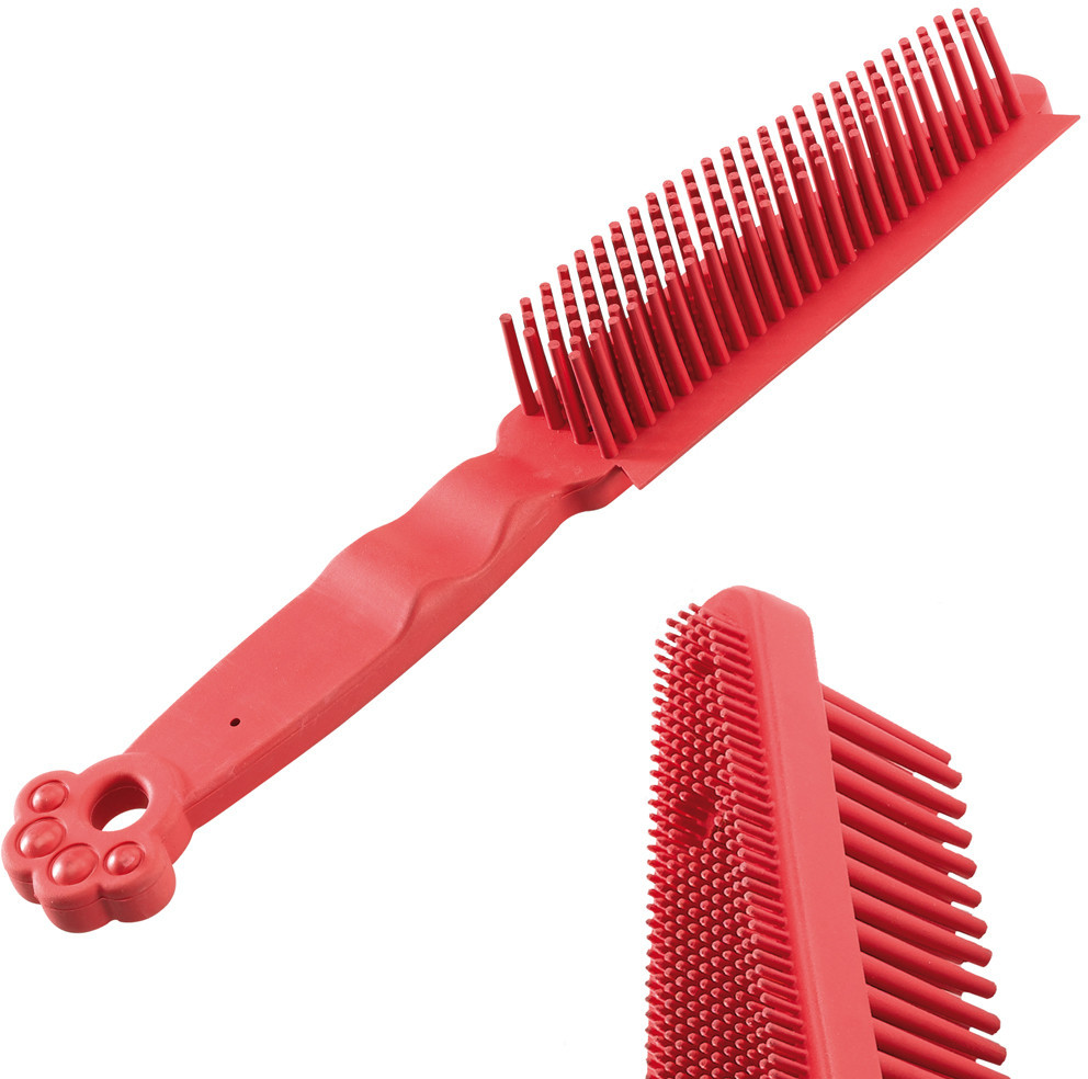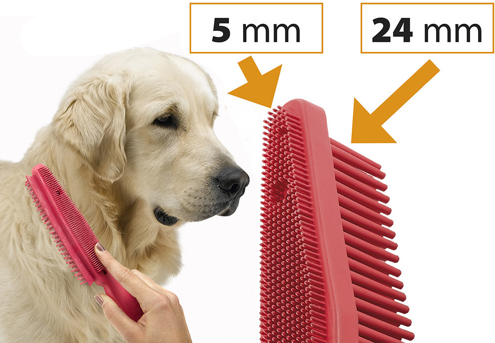 Резиновая щетка для сбора собачьей шерсти с мебели. Двусторонняя, с ворсинками 5 мм и 24 мм для шерсти разной длины: короткой, средней и длинной. Ручка оригинальной формы с лапой на конце, имеет отверстие для подвешивания.