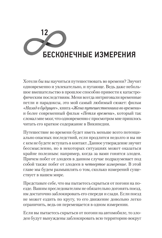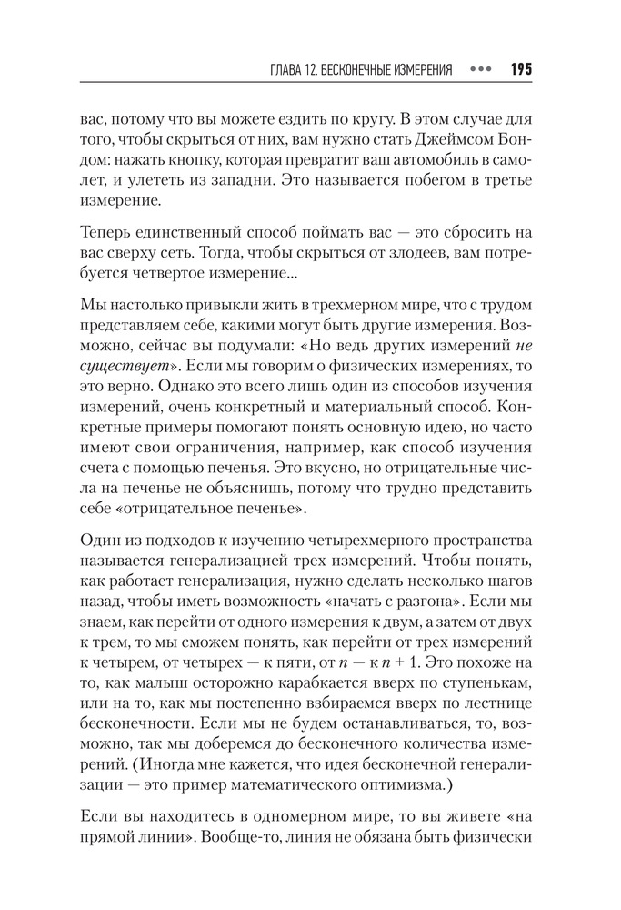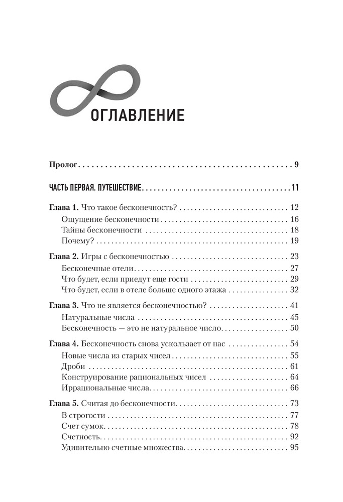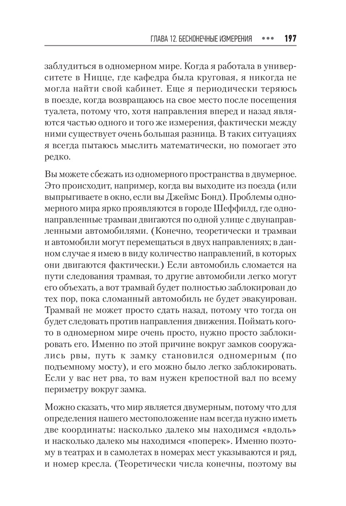 Очень странная книга. Автор ведет диалог с читателем, как будто ему лет 6. А в следующем абзаце начинает размышления о высоких абстракциях, либо о своей жизни, как она любит плавать и гулять пешком. Путанное повествование и переключение контекста не идет на руку этой книге. Последние главы вообще дерганные и нудные. Также есть претензии к редактору. Переносить текст сноски на следующую страницу - верх нелепицы. Это не аргументировано, текст сносок не был большим. За что стоит похвалить книгу - это за мысленные эксперименты и парадоксы. Мне пришлись по вкусу ее объяснения отеля Гильберта. И заигрывание с операциями над бесконечным множеством.