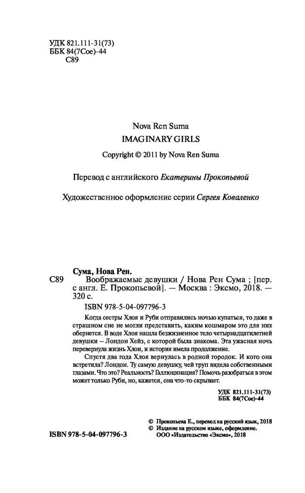 Воображаемые девушкиВ данный момент этот товар отсутствует в продаже. Возможно, у нас найдется аналогичный или похожий товар здесь. Серия: САСПЕНС. Читать всем Когда сестры Хлоя и Руби отправились ночью купаться, то даже в страшном сне не могли представить, каким кошмаром это для них обернется. В воде Хлоя нашла безжизненное тело четырнадцатилетней девушки — Лондон Хейз, с которой была знакома. Эта ужасная ночь перевернула жизнь Хлои, и история имела продолжение.Спустя два года Хлоя вернулась в родной городок. И кого она встретила? Лондон. Ту самую девушку, чей труп видела собственными глазами. Что это? Реальность? Галлюцинация? Помочь разобраться в этом может только Руби, но, кажется, она что-то скрывает. |