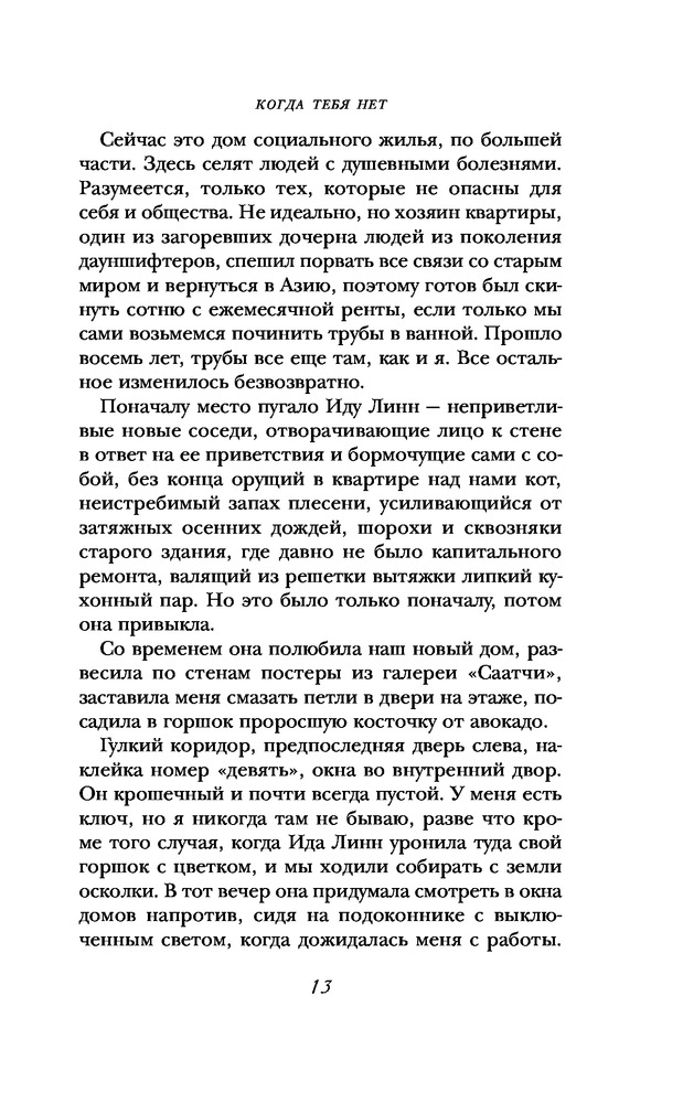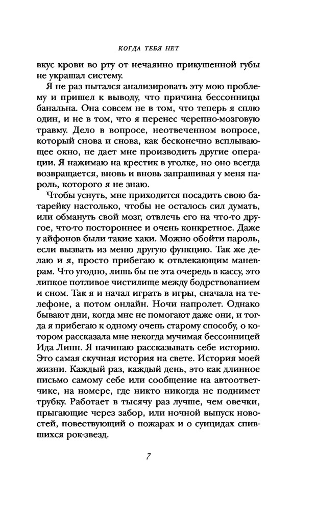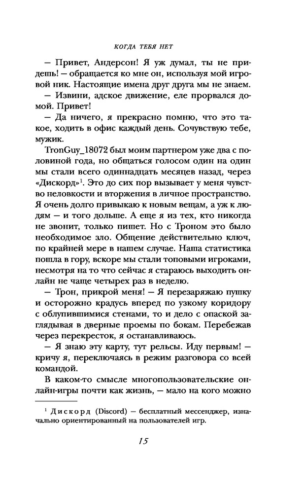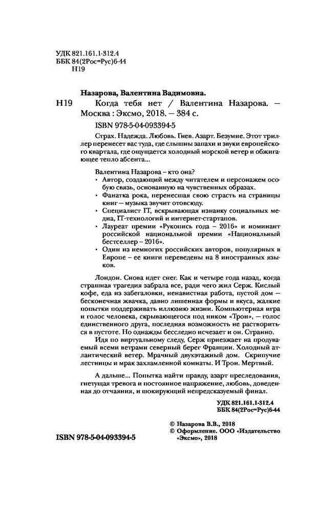Когда тебя нетВ данный момент этот товар отсутствует в продаже. Возможно, у нас найдется аналогичный или похожий товар здесь. Серия: Эмоциональный триллер Страх. Надежда. Любовь. Гнев. Азарт. Безумие. Этот триллер перенесет вас туда, где слышны запахи и звуки европейского квартала, где ощущается холодный морской ветер и обжигающее тепло абсента...Валентина Назарова — кто она?- Автор, создающий между читателем и персонажем особую связь, основанную на чувственных образах. — Фанатка рока, перенесшая свою страсть на страницы книг — музыка звучит отовсюду. — Специалист IT, вскрывающая изнанку социальных медиа, IT-технологий и интернет-стартапов.- Лауреат премии «Рукопись года — 2016» и номинант российской национальной премии «Национальный бестселлер — 2016». — Один из немногих российских авторов, популярных в Европе — ее книги переведены на 8 иностранных языков.Лондон. Снова идет снег. Как и четыре года назад, когда страшная трагедия забрала все, ради чего жил Серж. Кислый кофе, еда из забегаловки, ненавистная работа, пустой дом — бесконечная жвачка, давно лишенная формы и вкуса, жалкие попытки поддерживать иллюзию жизни. Компьютерная игра и голос человека, скрывающегося под ником «Трон», — голос единственного друга, последняя возможность не раствориться в пустоте. Но однажды бесследно исчезает и он. Странно. Идя по виртуальному следу, Серж приезжает на продуваемый всеми ветрами северный берег Франции. Холодный атлантический ветер. Мрачный двухэтажный дом. Скрипучие лестницы и мрак захламленной комнаты. И Трон. Мертвый.А дальше... Попытка найти правду, азарт преследования, гнетущая тревога и постоянное напряжение, любовь, доведенная до отчаяния, и шокирующий непредсказуемый финал. |