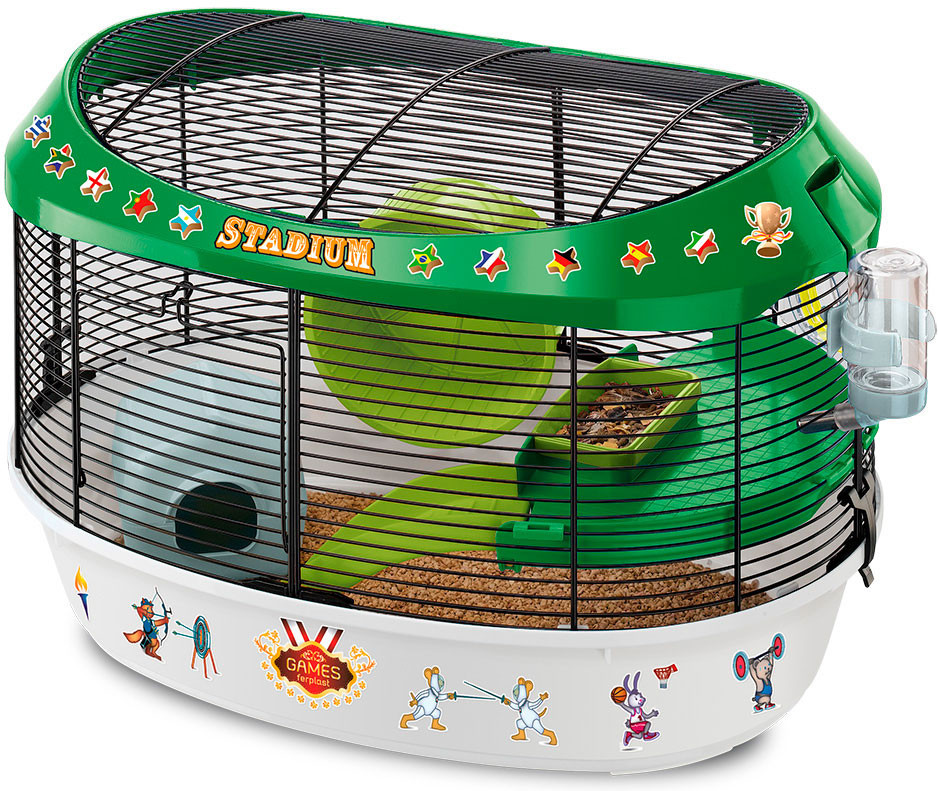 Клетка «Stadium» идет в комплекте с аксессуарами, такими, как гнездо, колесо для упражнений, кормушка, поилка, полочка и лесенка. Клетка имеет два уровня для различного времяпрепровождения: верхний уровень для приема пищи и питья, нижний уровень для отдыха и сна.