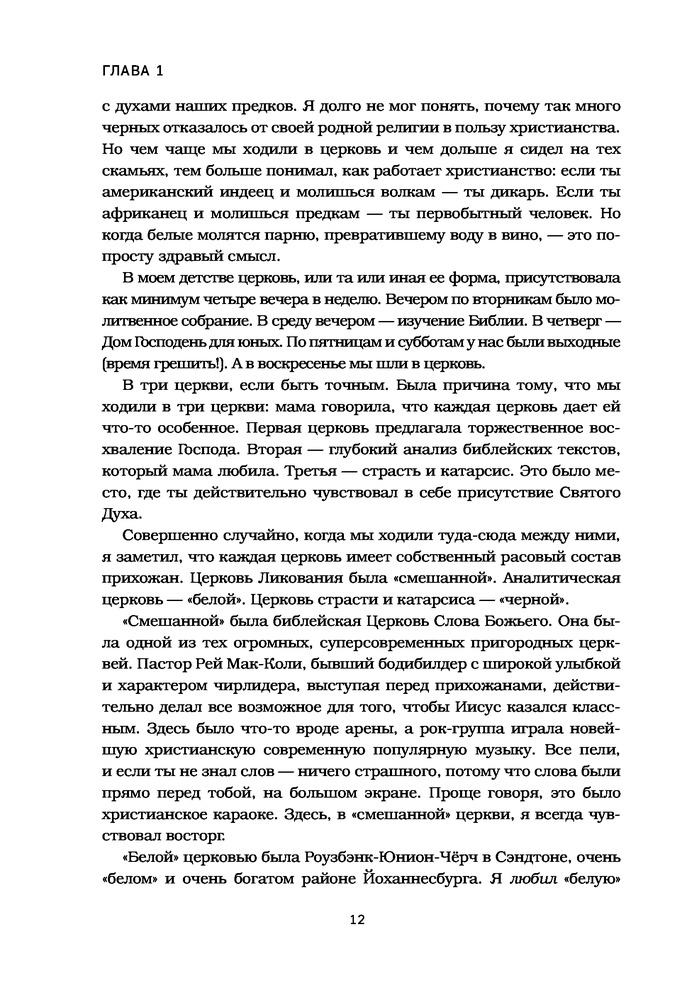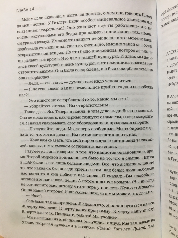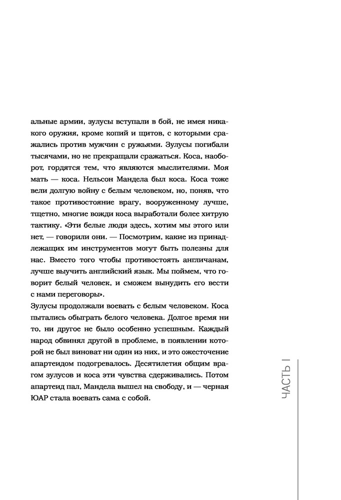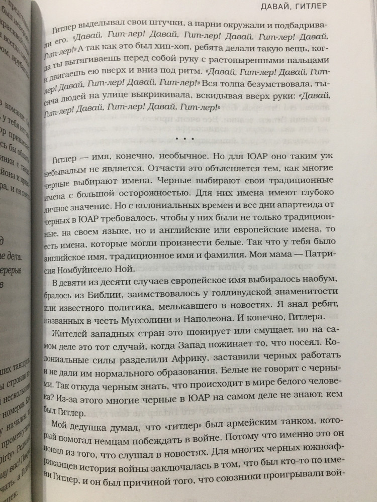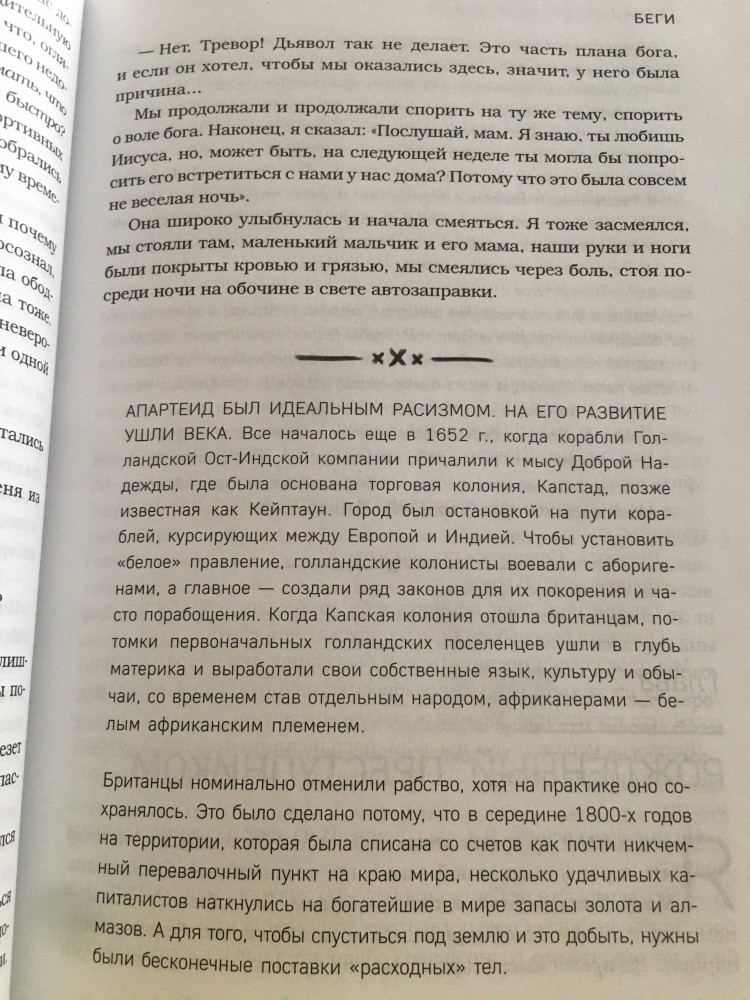 Замечательная книга! Смотришь на апартейт изнутри. Особенно книга будет интересна любителям творчества Тревора Ноа. Мне очень нравятся его стендапы и новостное шоу)) смело советую смотреть) НО даже если вы не знаете кто он, книга точно будет интересна. Она рассказывает о его жизни. А так как он был фактически незаконнорожденным (в оригинале книга так и называется - born in crime), то здесь конечно же идет речь еще и об апартейте (расизме) ЮАР, об африканерах, и искусственно созданной вражде между южноафриканскими племенами. Его мама - невероятно смелая и сильная женщина. Думаю много кого она вдохновит. Книга абсолютно не скучная. Написано интересно, много смешных историй. Иногда, читая книги, бывает пропускаешь скучные строки, но с книгами которые затягивают такого нет, эта книга как раз из таких. Да еще за такую цену. Берите, читайте и наслаждайтесь, не пожалеете)