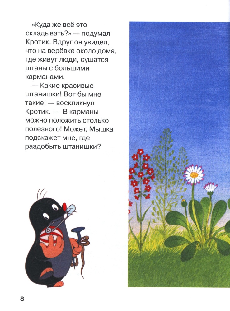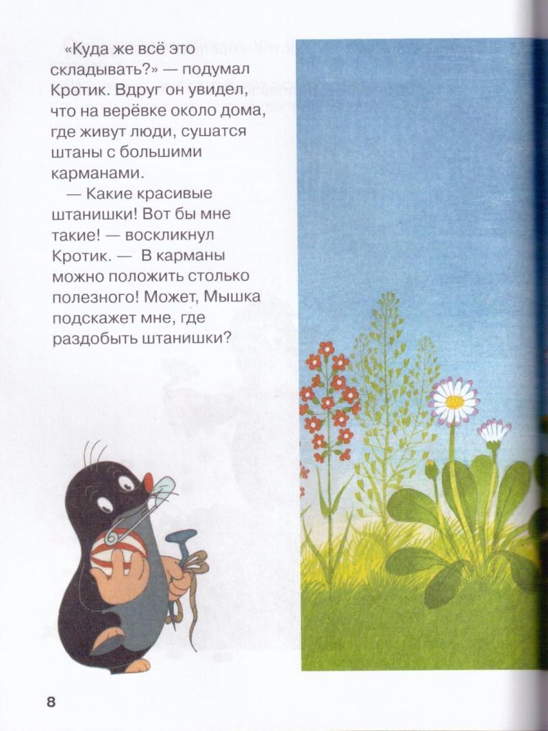 Отличное сочетание иллюстраций и текста, очень и очень интересная книга для малышей. Все очень близко и понятно им, и в то же время очень содержательно. Просмотрели содержание, сын попросил начать читать с истории про автомобильчик, потом про ракету и телевизор. Поэтому думаю, мальчикам будет особенно интересно. И последней по очереди прочли самую первую историю в книге, про штанишки. Оттуда он узнал весь процесс изготовления одежды ))) но настолько все интересно и легко. Всю книгу прочли за один присест, а в ней 208 страниц! Даже я устала, во рту пересохло, пошла попить воды, а сын начал просить читать снова ))) Очень рада, что купила ее, и всем советую. Если ваш ребенок не любит книги, и его надолго не удержать на одном месте, кротик - то, что вам нужно.