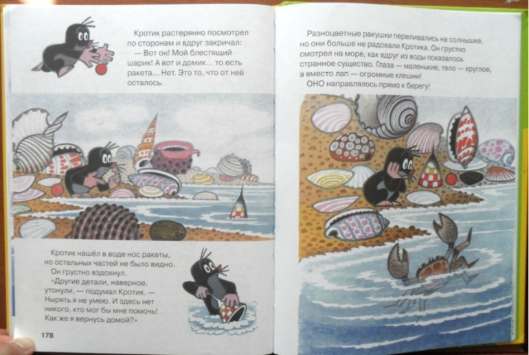 Очень красивая книга, крупные, красочные картинки. 3х летний сын доволен. Книга как раз для его возраста, ответы на все его вопросы Кто? Где? есть на замечательных картинках. В книге 4 истории: кротик и штанишки, кротик и телевизор, кротик и автомобильчик, кротик и ракета. Сейчас ждем другую книгу из этой серии - лучшие истории. Рекомендую!
