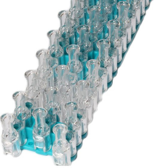 Станок для плетения симпатичных браслетов из красочных резинок выполнен из полых столбиков U-образной формы. Их вид напоминает прозрачные пробирки. Перед началом работы расположите станок стрелочками от себя, которые нанесены на его основании. |