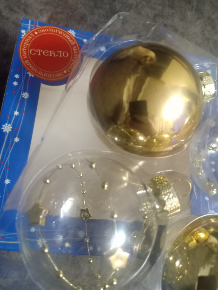 Шары красивые. На свету переливаются. Сначала думала ,что откажусь, но когда пришел заказ и я увидела их, то решила оставить. И хотя диаметр шаров 6 см ,они не смотрятся маленькими, благодаря свой воздушности. Материал стекло. Ооочень легкие.