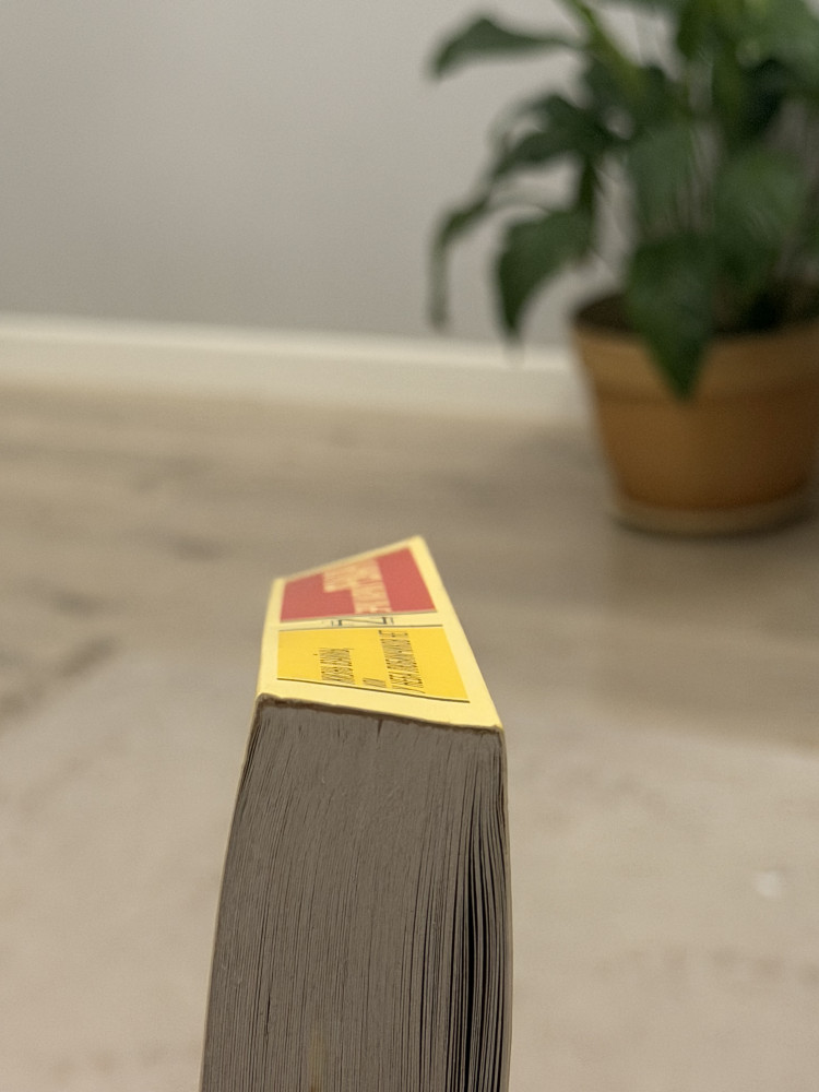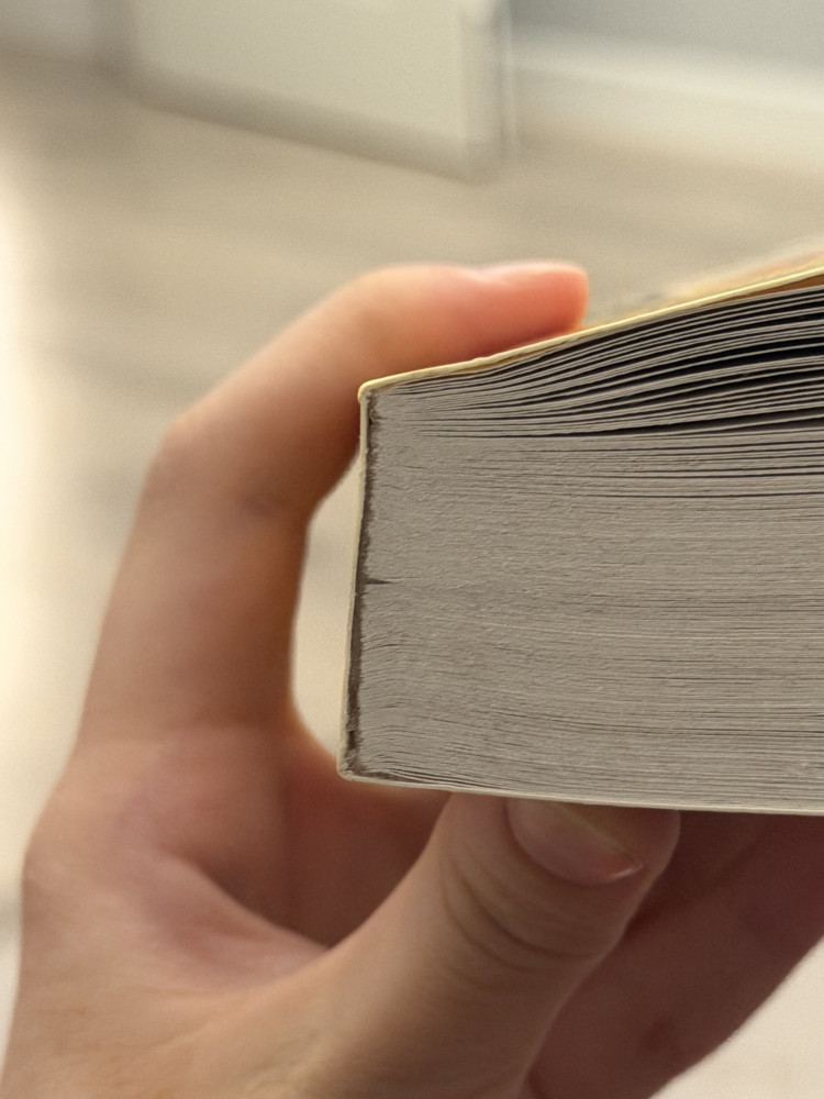 Немного неровный корешок, последние 5 страниц плохо держаться, но так вполне легко держать в руках, несмотря на количество страниц