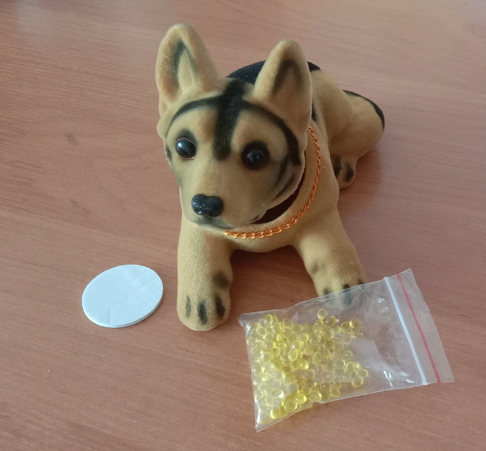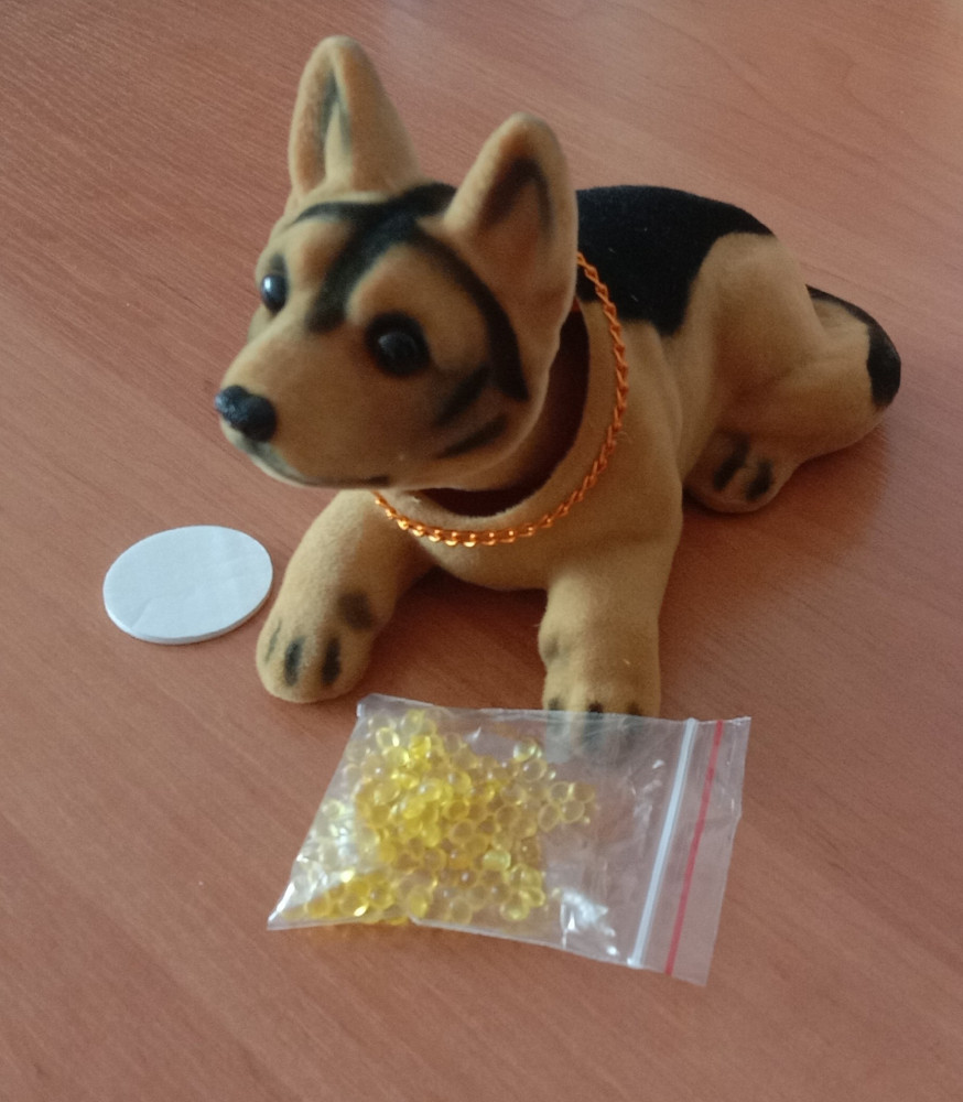 Собака очаровательная. Сделана очень качественно. Единственное, с чем не разобралась-это освежитель. В коробке был только круглый кусочек двустороннего скотча. Освежителя отдельно не было.