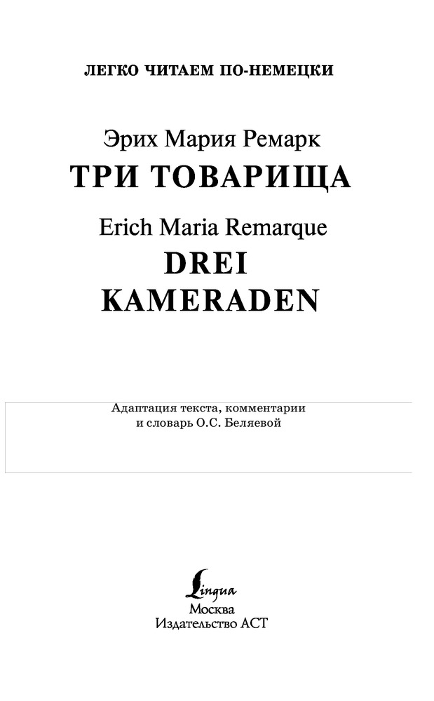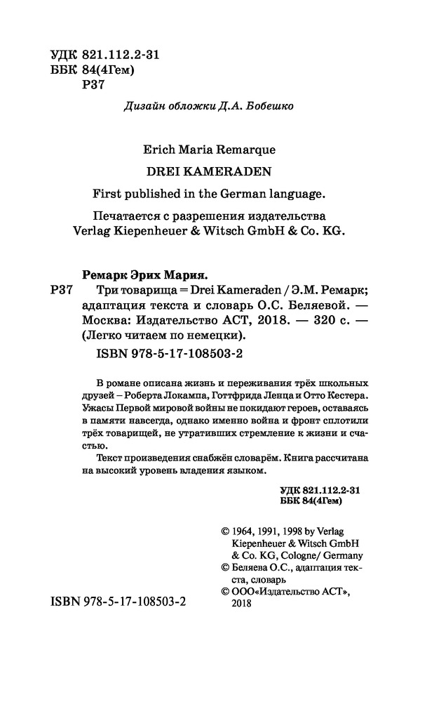 Три товарищаВ данный момент этот товар отсутствует в продаже. Возможно, у нас найдется аналогичный или похожий товар здесь. Серия: Легко читаем по-немецки В романе описана жизнь и переживания трёх школьных друзей — Роберта Локампа, Готтфрида Ленца и Отто Кестера. Ужасы Первой мировой войны не покидают героев, оставаясь в памяти навсегда, однако именно война и фронт сплотили трёх товарищей, не утративших стремление к жизни и счастью. |