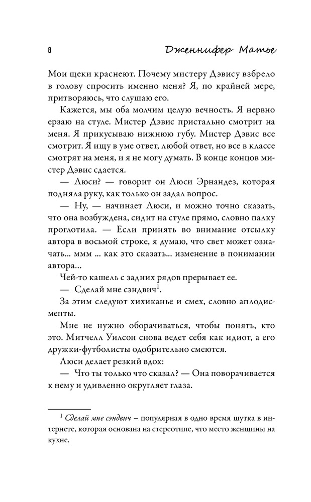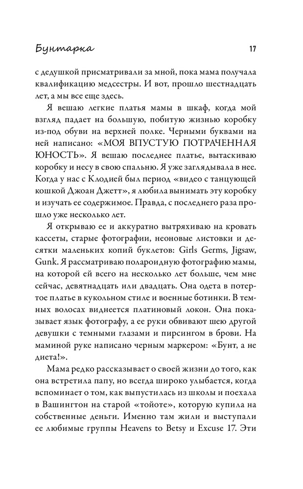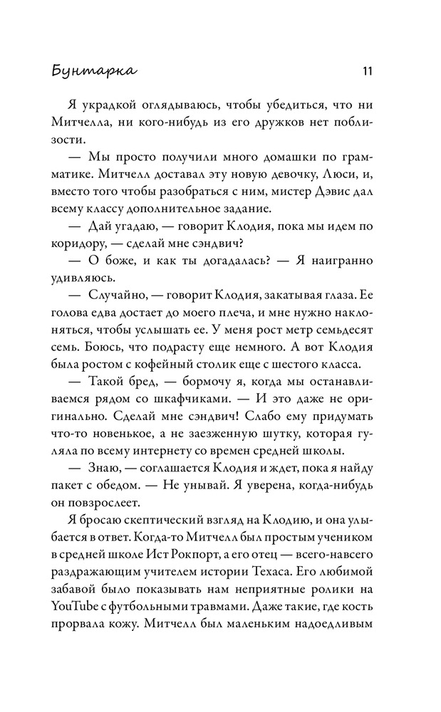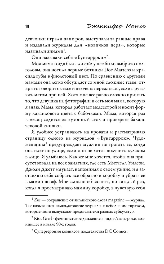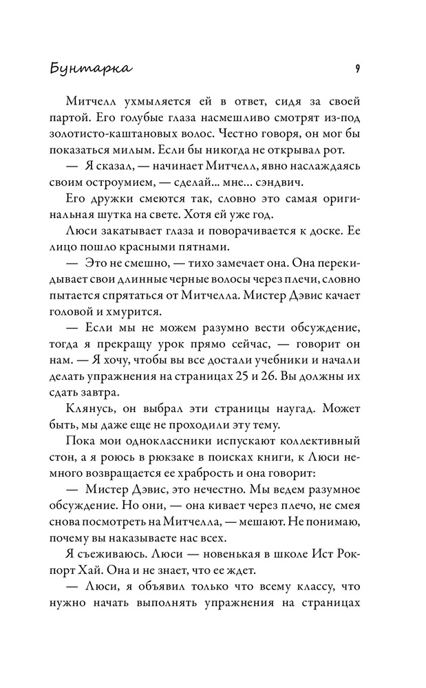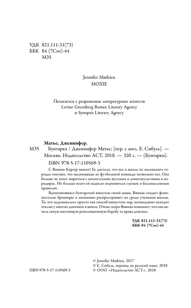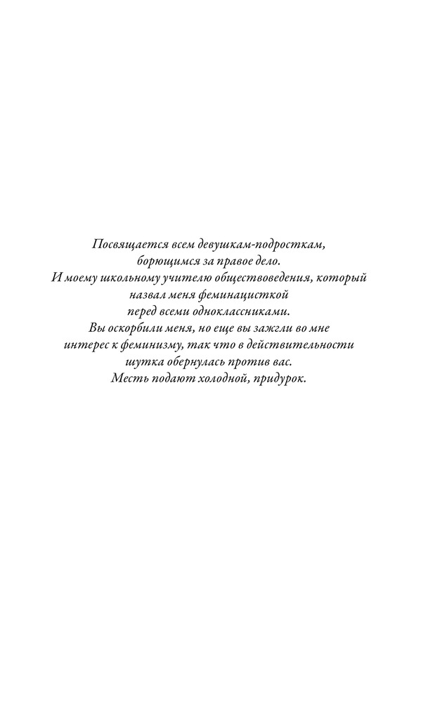 Серия: Бунтарки С Вивиан Картер хватит! Ее достало, что все в школе их маленького городка считают, что мальчишкам из футбольной команды позволено все. Она больше не хочет мириться с сексистскими шутками и домогательствами в коридорах. Но больше всего ей надоело подчиняться глупым и бессмысленным правилам.Вдохновившись бунтарской юностью своей мамы, Вивиан создает феминистские брошюры и анонимно распространяет их среди учеников школы. То, что задумывалось просто как способ выпустить пар, неожиданно находит отклик у многих девчонок в школе. Очень скоро Вивиан понимает, что она начала самую настоящую революционную борьбу за права девушек. |