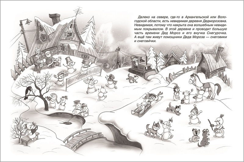Мои дети вообще поклонники Усачёва. И эта книга не стала исключением. Истории живые и интересные. Переплет твердый, страницы тонкие, иллюстрации чёрно-белые, но от этого книга не становится хуже, наоборот приобретает какою-то теплоту, становится ещё более уютной. Дети сами придумывают цвета убранству снеговиков, окрас животным. На первой большой картинке играли в загадки кто где спрятался, потом по мере прочтения снова смотрели и находили персонажей по фамилиям или с какой истории действие. Короче, очень советую. А ещё чёрно-белые картинки отлично развивают детскую фантазию. Столько всего было придумано )))