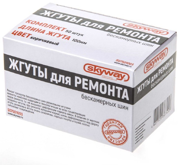 Жгут для ремонта бескамерных шин — ремонт проколов бескамерных шин резиновыми синтетичсескими жгутами является наиболее щадящим и технологичным из всех существующих видов ремонта, так как не вызывает деформации каркаса шины. В отличие от жестких кордовых жгутов , при ремонте которых каркас шины деформируется под форму жгута, резиновые жгуты очень эластичны, хорошо тянутся и более плотно заполняют повреждение.