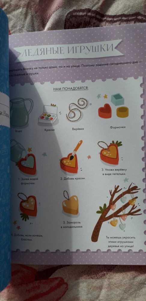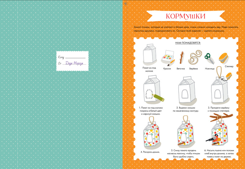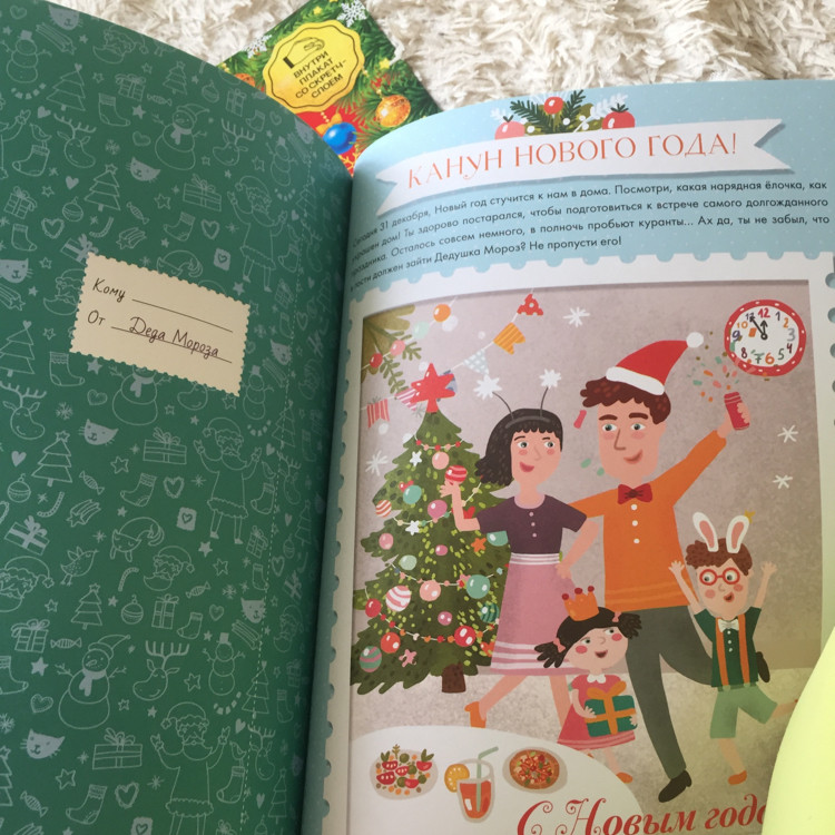 Замечательная книга! Задания на каждый день декабря месяца. Листы нужно вырезать и складывать конвертом. С обратной стороны яркие и разноцветные. Подписаны - От Деда Мороза. А родителям нужно вписать имена детей, которым он "прислал" задания. В книге предлагается развешать конверты на верёвочке, тогда дети будут видеть, сколько дней осталось до праздника. Или подкладывать по подушку. Всем рекомендую!