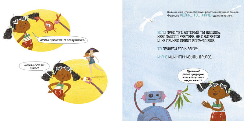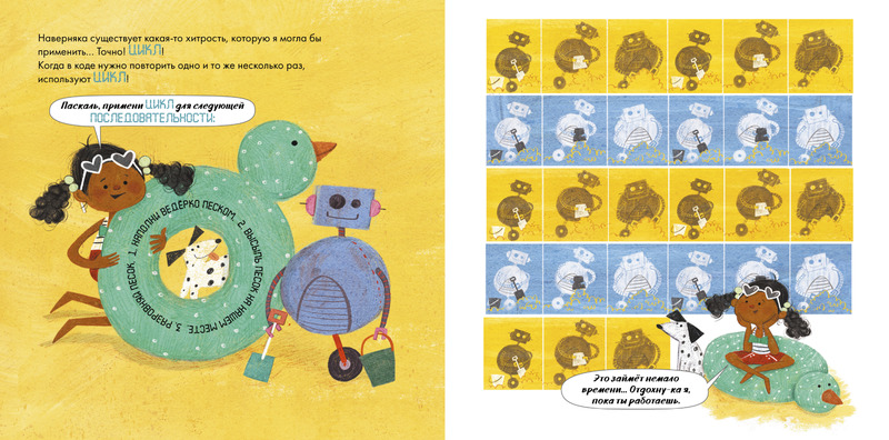 Отличная книга! Большая, яркая, с весёлыми картинками. Для изучения основ - само то. Мне, как родителю и специалисту ИТ, книга понравилась, дочери 6-ти лет - тоже. Просит перечитывать по несколько раз, как берёт книгу в руки. Содержание соответствует описанию товара на сайте. В книге на детском уровне рассказывается про сущность декомпозиции, типы алгоритмов (а алгоритм - это основа любой программы): линейные, разветвляющиеся, циклические. В конце книги имеется небольшой словарик терминов.