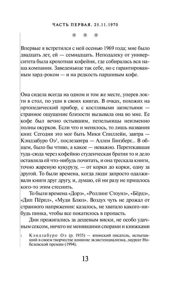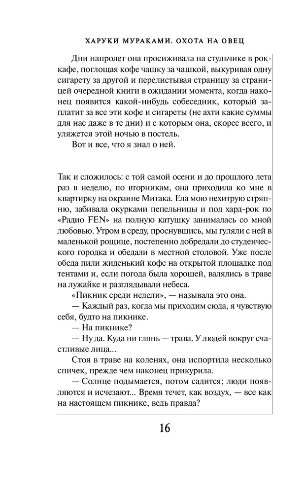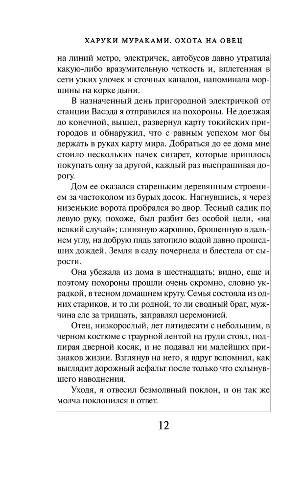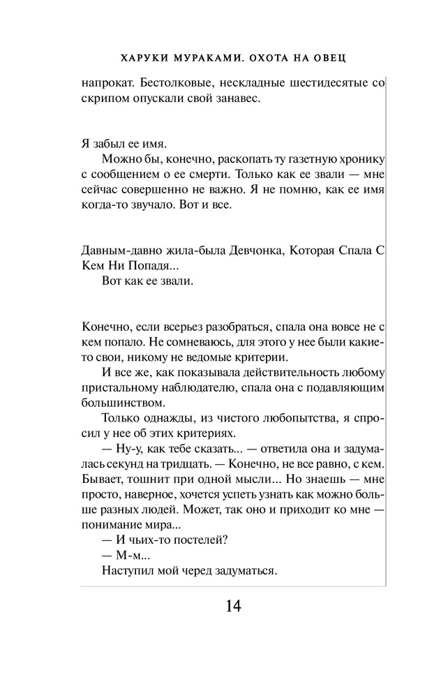 и так, я огромный фанат Мураками, так что можете меня слушать и с тремя ушами. Читал конечно взахлеб, прочитал за два дня, книга жуть какая интересная и странная. Понял, что Мураками с каждым годом становится все лучше и лучше. "Охота на овец" – его то ли второе то ли третье произведение. "Мужчины без женщин" – его последнее(на этот момент) произведение(не дай бог, пусть будет не последним). Сравнивая эти две книги можно сказать, что Мураками – человек-стрела. Что я хочу сказать? Я хочу сказать, что да, произведение это мне не понравилось. Слишком много воды. Ну вот казалось бы, зачем ты описываешь как выглядит дорога и места, в которых он побывал целыми страницами. Если бы Мураками был фанатом цитаты Чехова про ружье, которое не выстрелило, я уверен, это произведение было бы на 150-200 страниц. Но если вы ярый фанат Мураками, то да, прочитать стоит. Но для первого ознакомления с этим автором эта книга точно не подйдет. т.е., если вы не читали этого автора, не покупайте эту книгу. начните с книг "Норвежский лес" или "Мой любимый sputnik". P.S. "Мой любимый sputnik" – моя самая любимая книга.