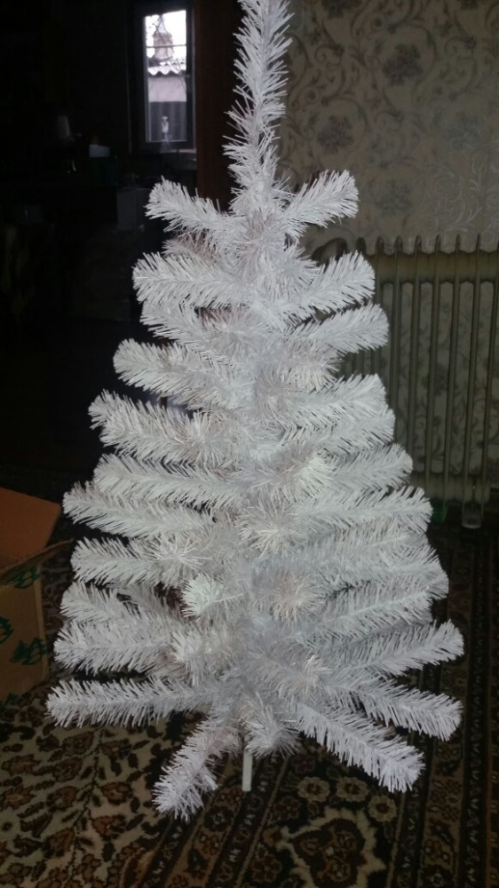 Белая, маленькая ёлочка 100 см. подставка пластмассовая, устойчивая. Отличается от фото на сайте. Но мне нравится, много места занимать не будет