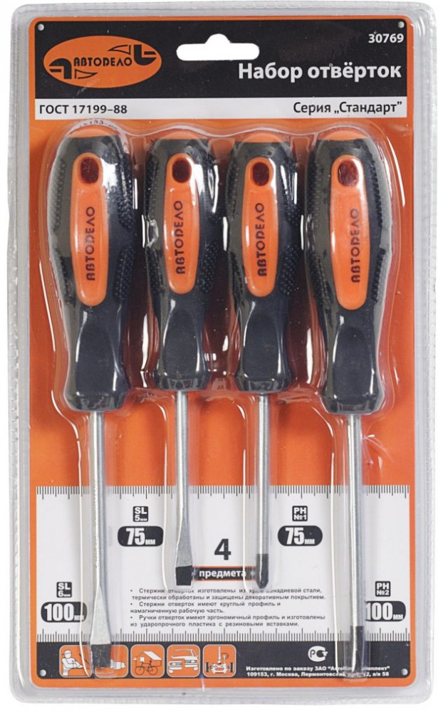 Набор отверток АвтоДело c двухкомпонентной ручкой. Стержни каждой отвертки изготовлены из хром-ванадиевой стали, термически обработаны и защищены декоративным покрытием.Отвертки имеют круглый профиль и намагниченную рабочую часть.