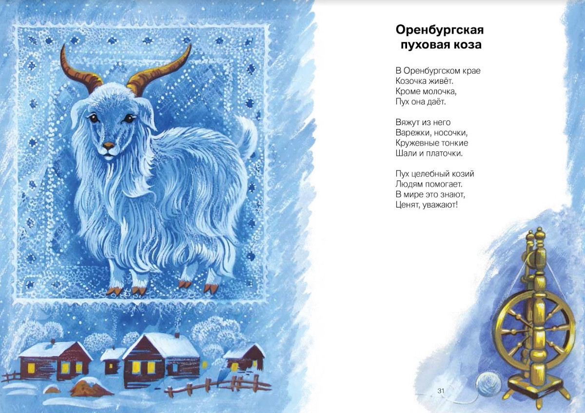 Замечательные, понятные деткам стихи. Наш любимый - про оренбургскую пуховую козу, варежки, носочки, шали и платочки ) Книга в хорошем переплёте, цвета и рисунки яркие