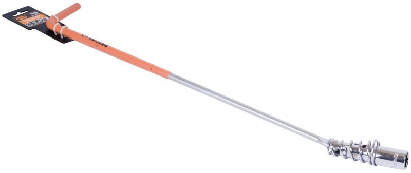 Ключ свечной с карданом, пружина с резиновой вставкой — ключ изготовлен методом горячей штамповки (ковки на молотах). Ручка ключа L-образная с полимерным покрытием, предотвращающим проскальзывание ладони. Ключ имеет стандартный шестигранный рабочий профиль. Рабочая часть ключа снабжена резиновыми вставками для удерживания свечей. Ключ укомплектован стальной пружиной для удобства использования. Защищен от коррозии хромовым защитно-декоративным покрытием с эффектом матовой поверхности.
