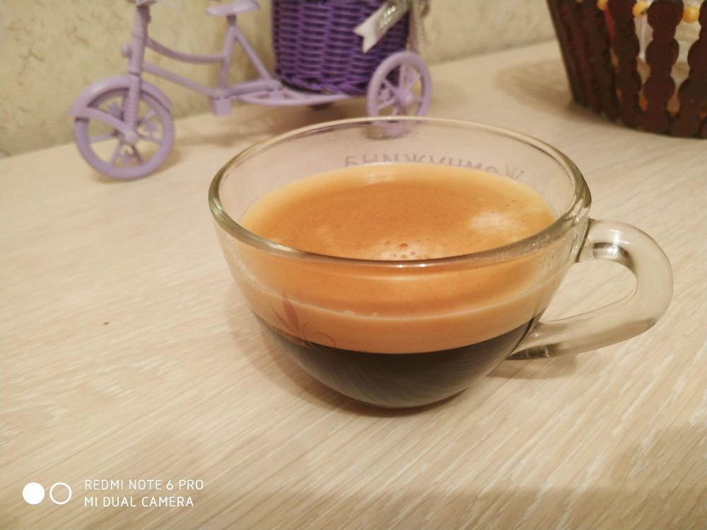 Хороший, крепкий кофе. Нагреваю кружку кипятком, сыплю ложку кофе и заливаю кипящей водой. Увидела у блогеров, всё как они показали.