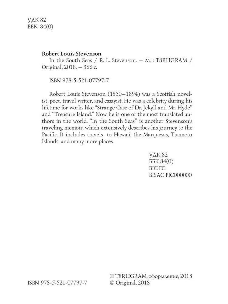 💳 Оплатить за товар можно при получении 🇰🇿 Есть бесплатная доставка по Казахстану от 1 дня 🎁 Копите бонусы с каждой покупки Серия: Original Robert Louis Stevenson (1850–1894) was a Scottish novelist, poet, travel writer, and essayist. He was a celebrity during his lifetime for works like «Strange Case of Dr. Jekyll and Mr. Hyde» and «Treasure Island.» Now he is one of the most translated authors in the world. «In the South Seas» is another Stevenson’s traveling memoir, which extensively describes his journey to the Pacific. It includes travels to Hawaii, the Marquesas, Tuamotu Islands and many more places. |