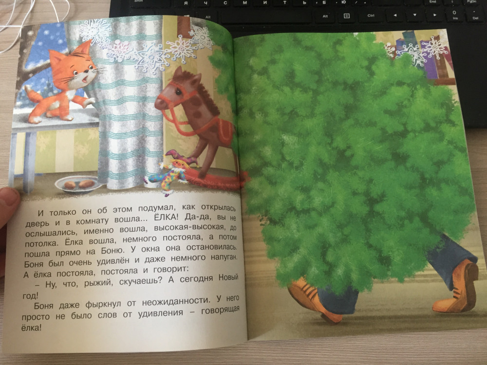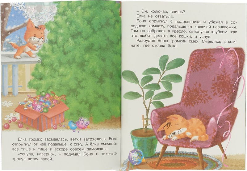 Татьяна Коваль «Котёнок и ёлка» 😻🎄❄ Количество страниц: 16 Чудесная новогодняя книга для маленьких детей. Рассказ небольшой, но интересный, с загадкой. В квартире, где живёт котёнок Боня, появляется зелёная красавица. Замечательные яркие иллюстрации представлены в этом издании, шрифт крупный. Обложка из картона средней плотности, покрыта плёнкой. Листы также средней плотности, лощёные. Размер примерно A4. Такую книжечку приятно держать в руках. Издательство: «Фламиного», 2020. Художник: М. Н. Комарова.