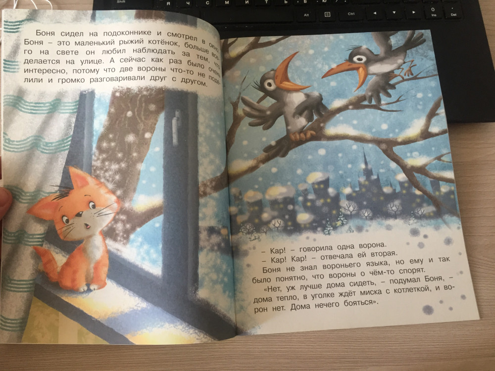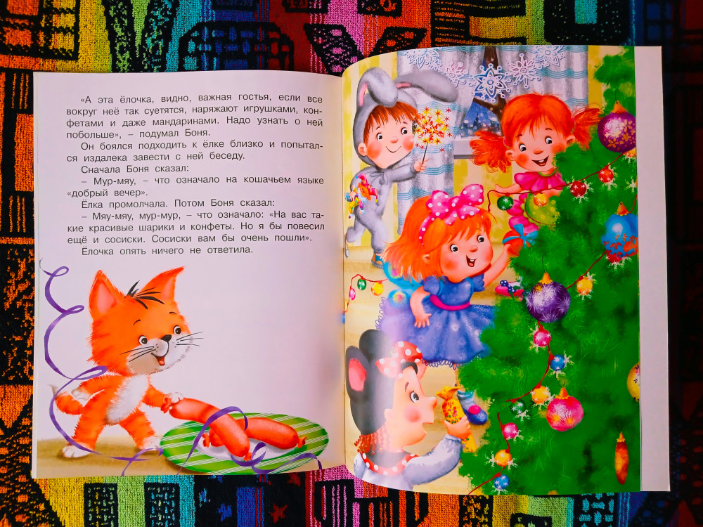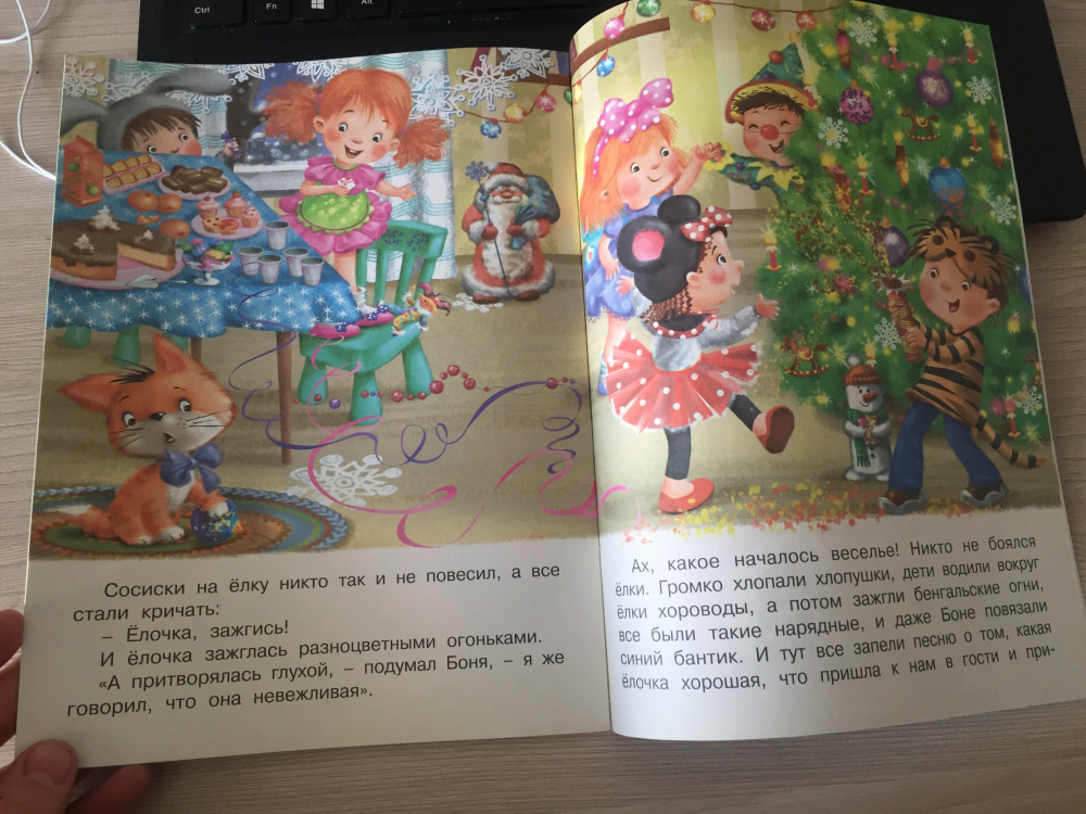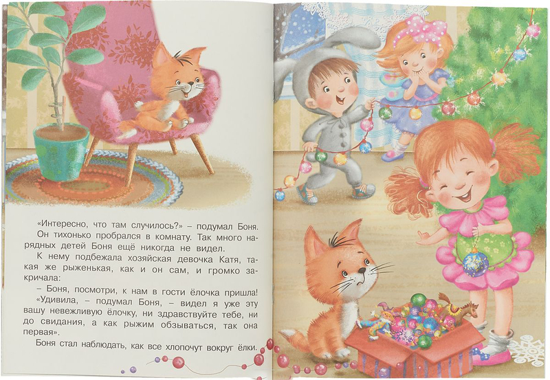 Купили несколько книжек из серии про котенка Боню. Ребенку 2.5 года нравится. Рисунки милые, истории забавные. Но именно книжка про елку - в тонком переплете и сама бумага хуже качеством, от чего рисунки более блеклые.