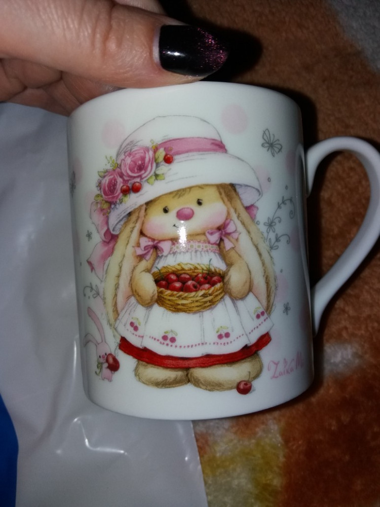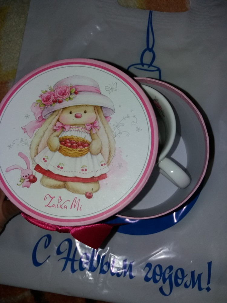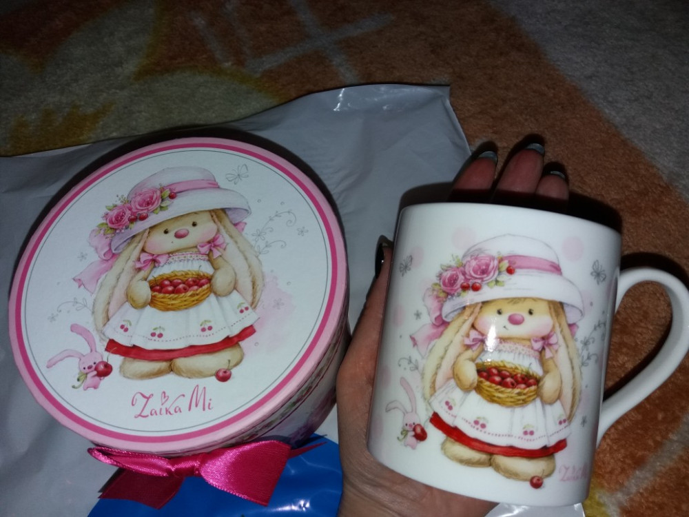 Взяла на подарок. Очень милая кружка. Коробочка бесподобная. Хорошая идея в оформлении для подарка. Яркая, красочная. Милый зайчонок.